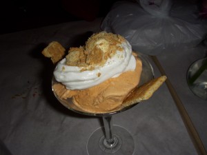 Josh had the crème brulee with a lemon cookie. The crème brulee was served in a deep ramekin that I normally think of as a souffle ramekin, but I kind of liked it because there was more custard than sugar topping (I’m one of those weird people who don’t like the burnt sugar crust on crème brulee). There was a nice vanilla flavor to the crème brulee but I found it a bit too sweet overall. It did have a nice consistency to it though.