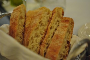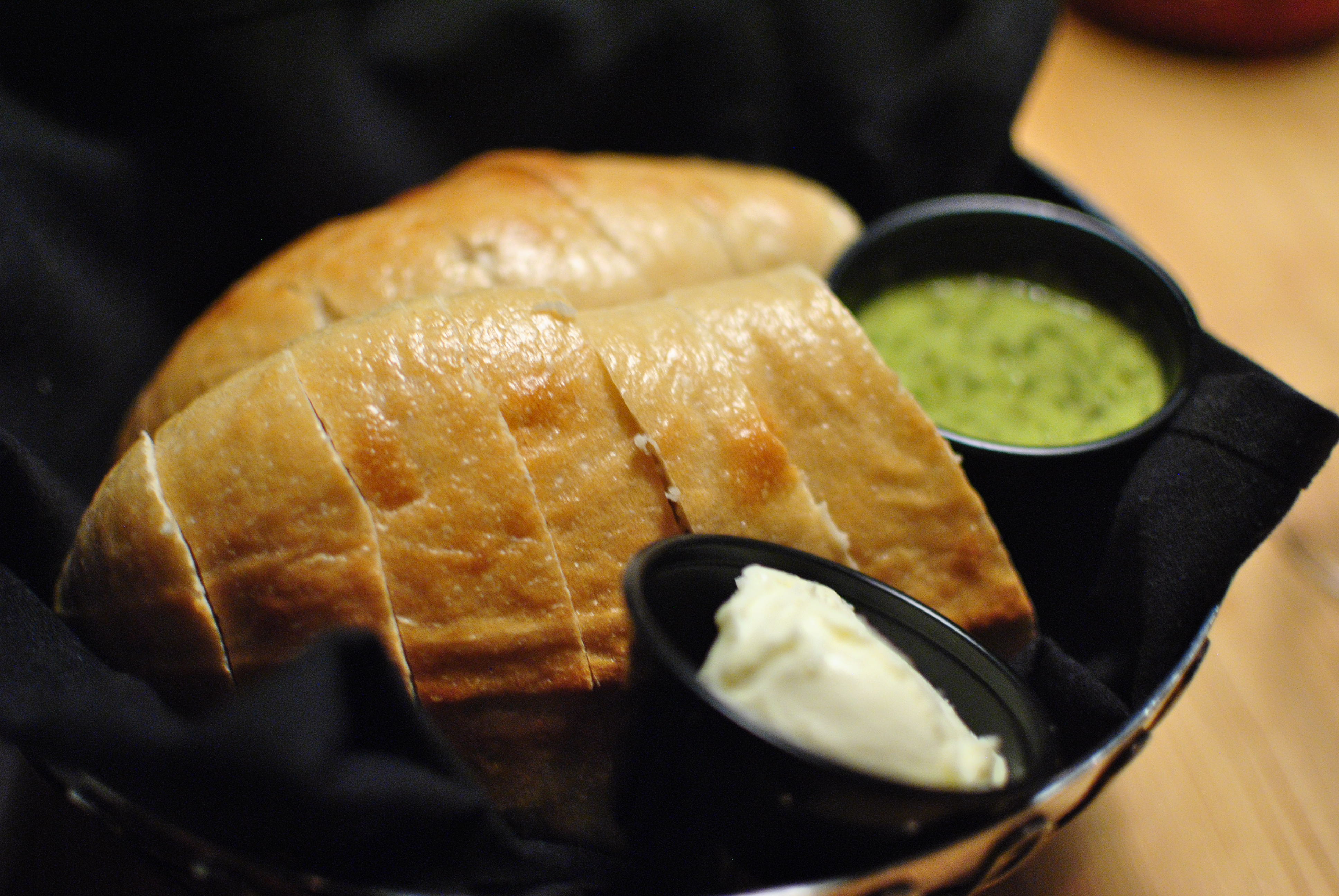 After placing our orders, we were starving so we eagerly dug into the bread, which was a soft white bread with a chewy interior that had good flavor but wasn’t very crispy on the outside. Still, it was nice and warm, and it paired wonderfully with the accompanying soft butter and a tangy green chimichurri sauce that was a somewhat unusual but tasty offering with bread.