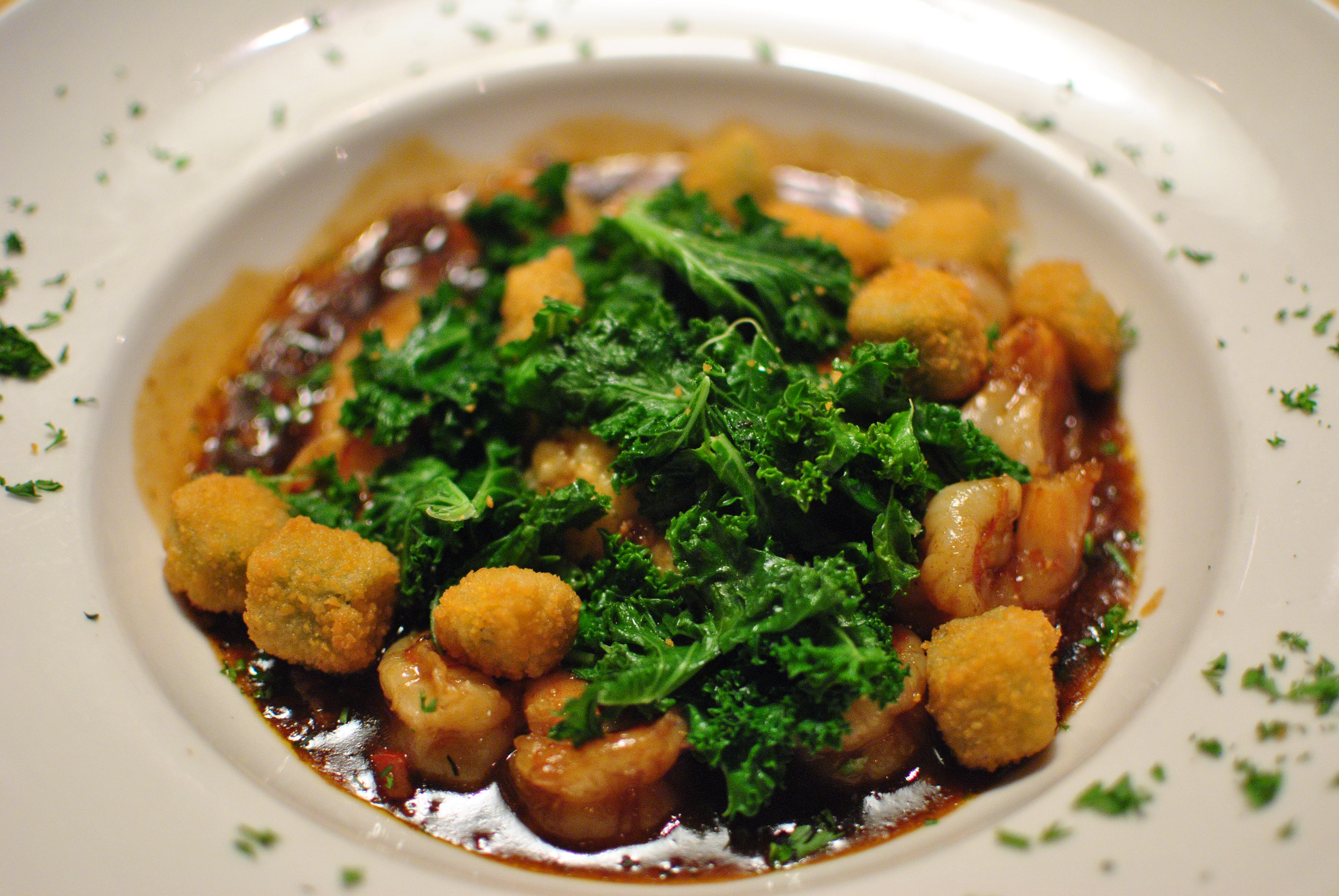 Shrimp and grits with chorizo gravy, fried okra, and sauteed kale