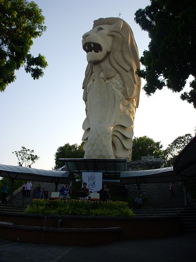 Giant merlion statue - the merlion is the mascot of Singapore. It has the head of a lion ("Singa" means lion) and the body of a fish.