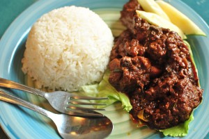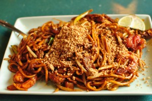 For our main courses, we split an order of mee goreng and curry chicken with rice. The chicken was served in pieces on the bone, and the curry sauce was different from the chicken curry dipping sauce that we had with the roti canai. This was much thicker and richer, less coconuty in flavor. It was definitely like a stew rather than the thin curry sauce that I’m used to. The flavors were pretty concentrated though, and I liked taking the chicken off the bone and mixing everything into the rice.