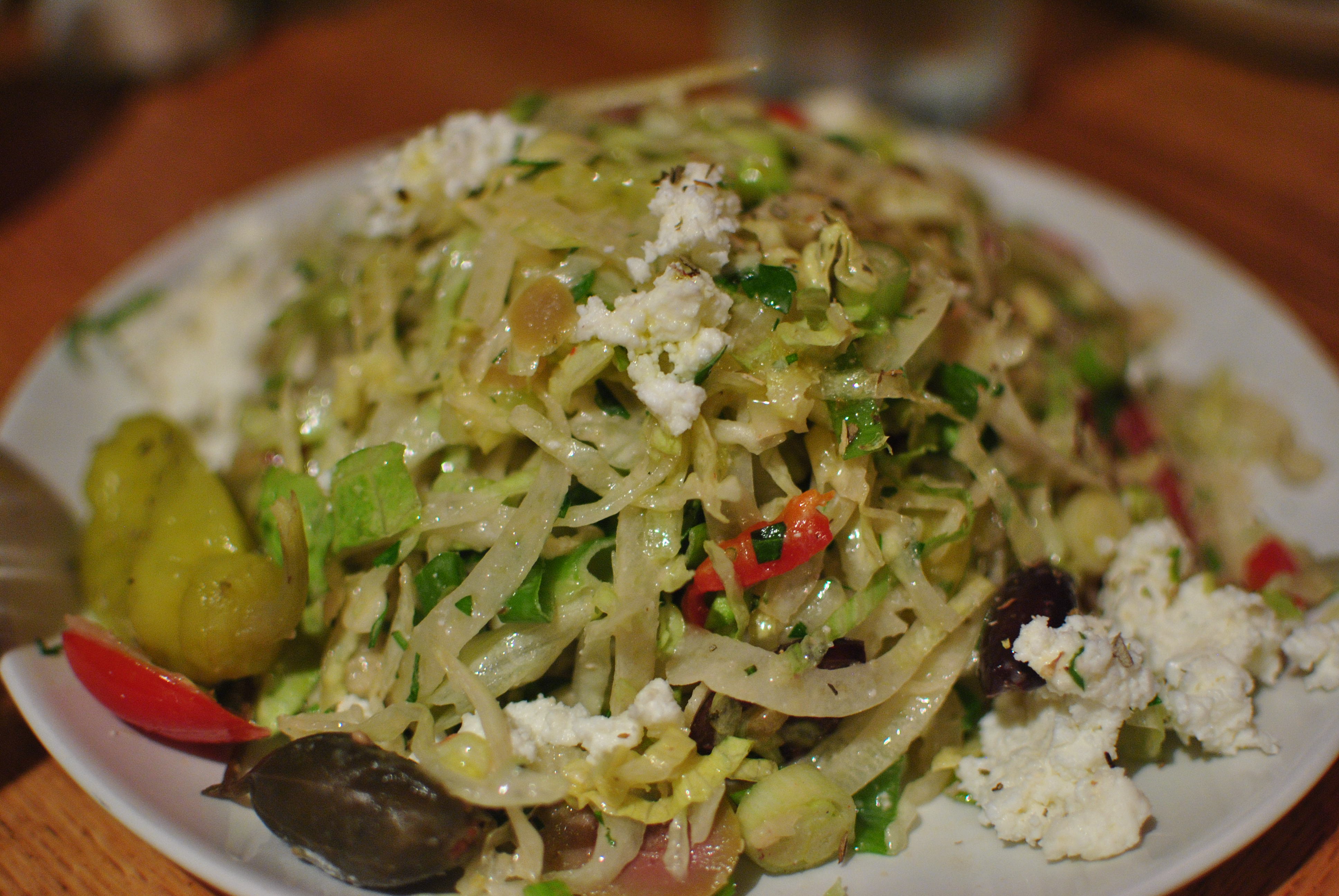 We also got an order of the Kefi salad, which was shredded lettuce and fennel with tomato, cucumber, olives, peppers, onions, and feta. This salad had similar ingredients to the feta dish but it was way more balanced. The lettuce and fennel were crisp and refreshing, and none of the other ingredients were overpowering.