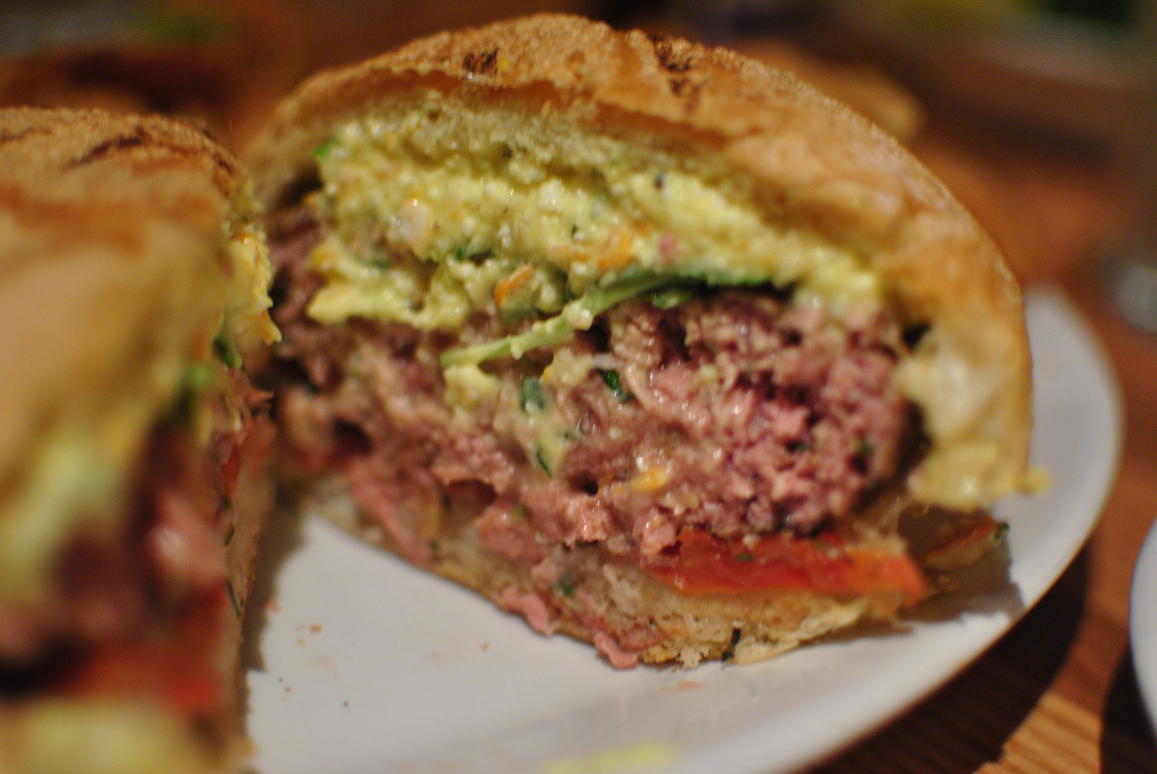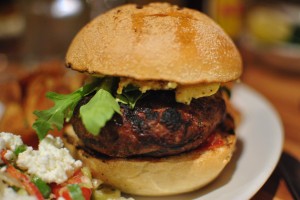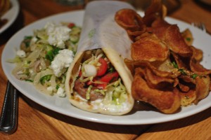 For our entrees, Josh and I went halfsies on the pork souvlaki and the Kefi burger. The souvlaki was wrapped in pita bread and topped with tzatziki sauce, lettuce, and tomato. It was presented street style – wrapped in wax paper – which made it easier to eat because the sandwich would have been too messy otherwise. It came with a small salad and thick cut potato chips on the side. The pork was tender and flavorful, standing up to the other ingredients in the wrap. It was one of the best souvlaki sandwiches that I had and reminded me of the gyros we had during our honeymoon in Greece. The potato chips were quite good as well, especially if you’re a fan of darker chips. They were crunchy and had just enough salt sprinkled on top.