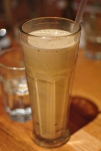 Josh and I passed on dessert, though I did taste some of the rice pudding, which had a nice cinnamon flavor and was topped with an apple mixture that reminded me of apple pie filling. Sounds like a weird combination, but it was actually pretty tasty. Instead we had some caffeine – a frappe for me and a regular coffee for him. The frappe was thick and frothy, not too bitter. The regular coffee was pretty standard but I loved the mug it was served in, which was modeled after the classic Greek takeout coffee cups.