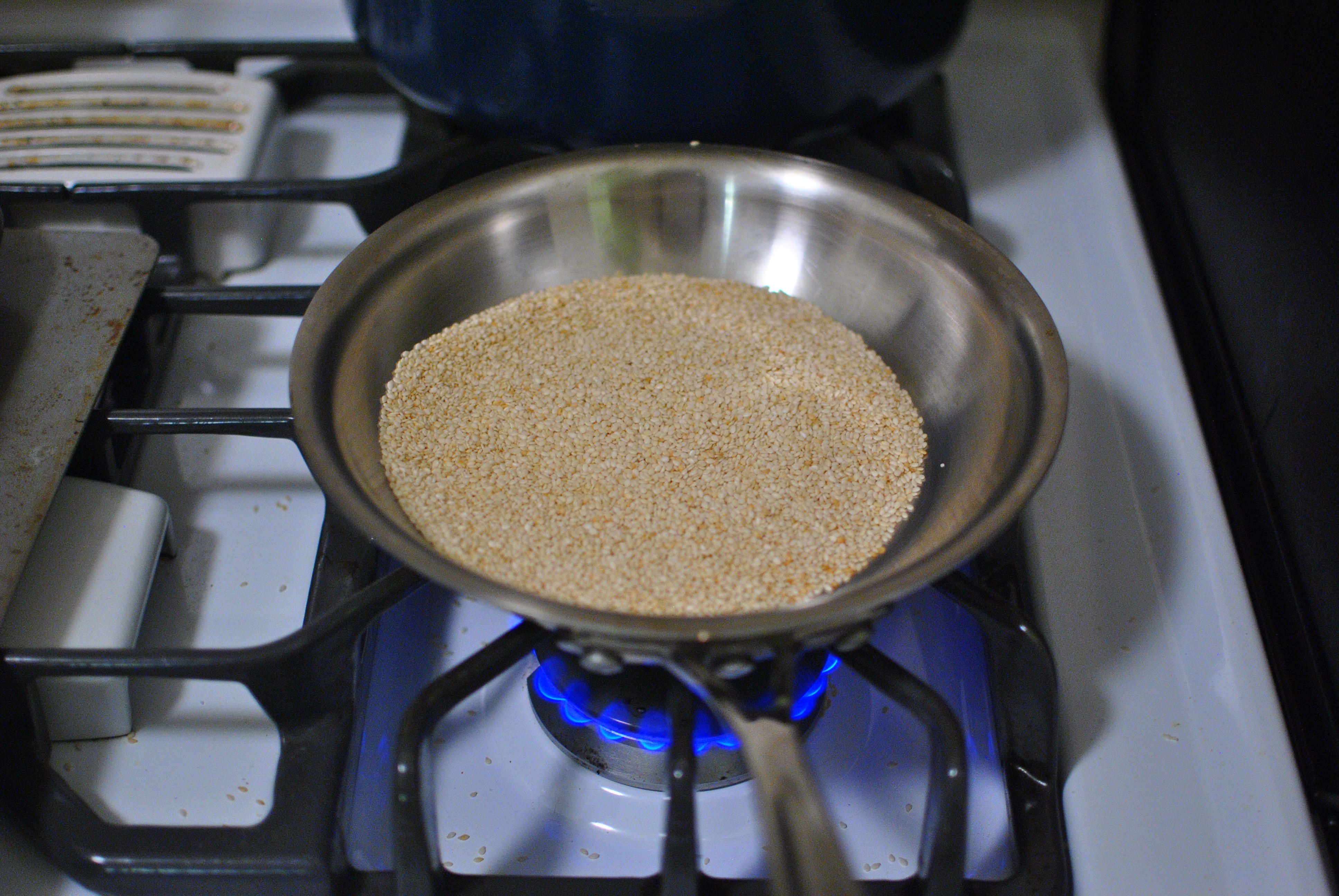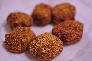 Josh toasted up some sesame seeds in a pan, which we used to coat the falafel balls. We also ground up a handful of the seeds with some olive oil to make a sort of tahini sauce, though it wound up being slightly too bitter. Next time I’ll just buy pre-made tahini sauce.