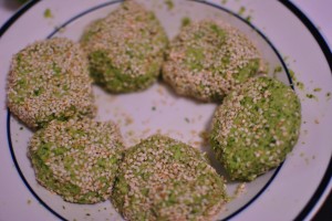 To make the balls, I wet my hands a little and then scooped up some of the falafel mixture and rolled it into a sphere using the palms of my hands. Then I flattened it a little to make a patty shape, and then rolled it in the toasted sesame seeds. I repeated the process until I used up all of the mixture.