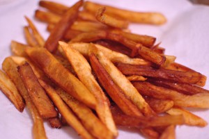 Since we had oil ready for deep frying, I couldn’t resist making a batch of homemade french fries. It was easy – just cut a few potatoes into french fry shapes. You can make them as thick or as thin as you want. Fry them up in batches so they have enough room to get crispy on the outside. Drain on paper towels and season with salt and pepper immediately. Eat while they’re warm and fresh out of the oil.