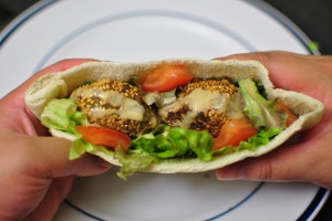 To serve, we heated up some pita bread in the oven, then cut them in half to expose the pockets. We filled each pocket with a few falafel balls, plus chopped lettuce and tomatoes. Then we drizzled some of the homemade tahini sauce on top. It was pretty freakin’ delicious, I have to say. The falafel was really flavorful and had great texture. They were crispy on the outside and moist in the middle. We could taste the fava beans and the herbiness of the carrot greens, while the cumin bound everything together. We were extremely pleased with how these turned out.