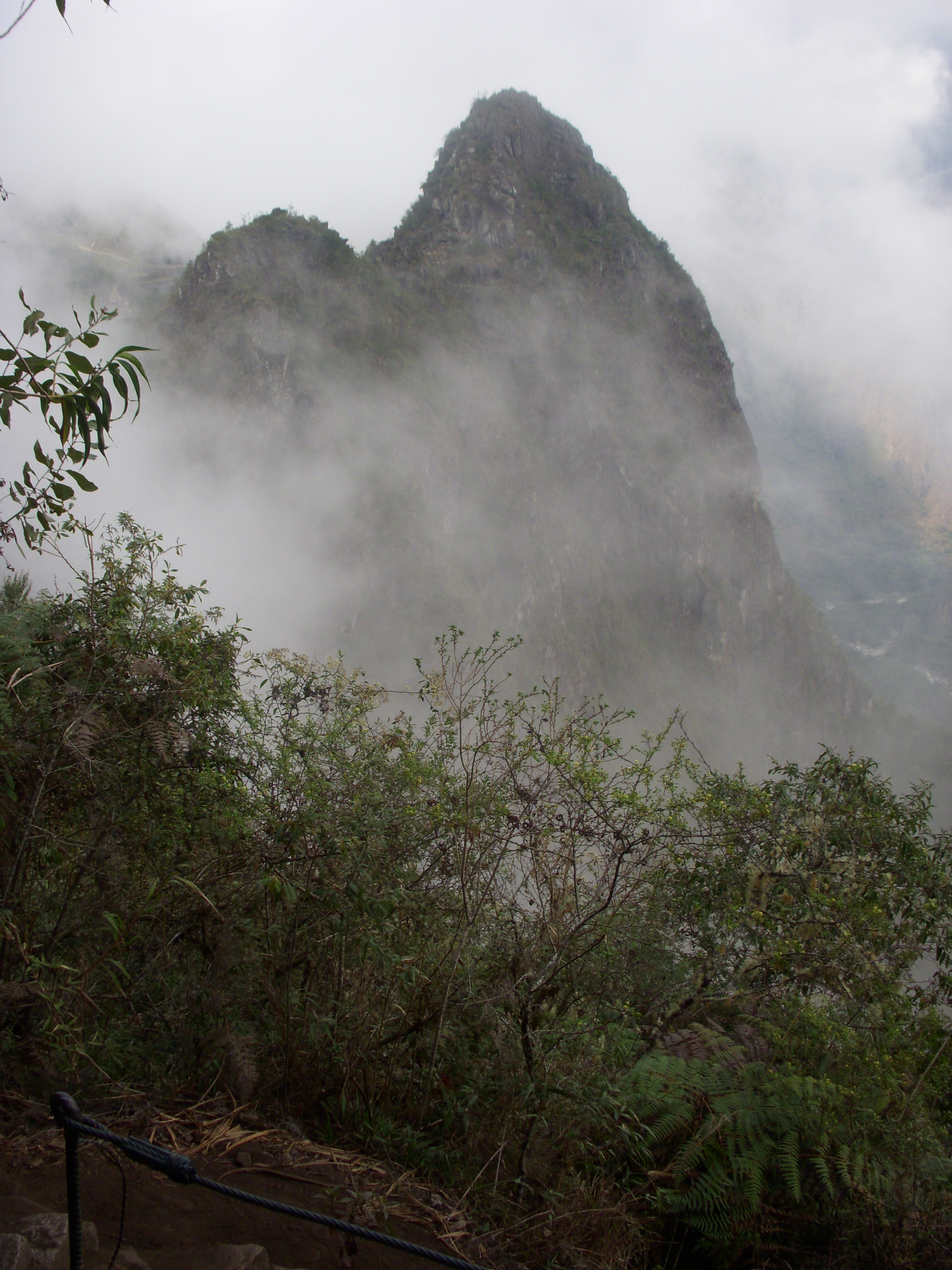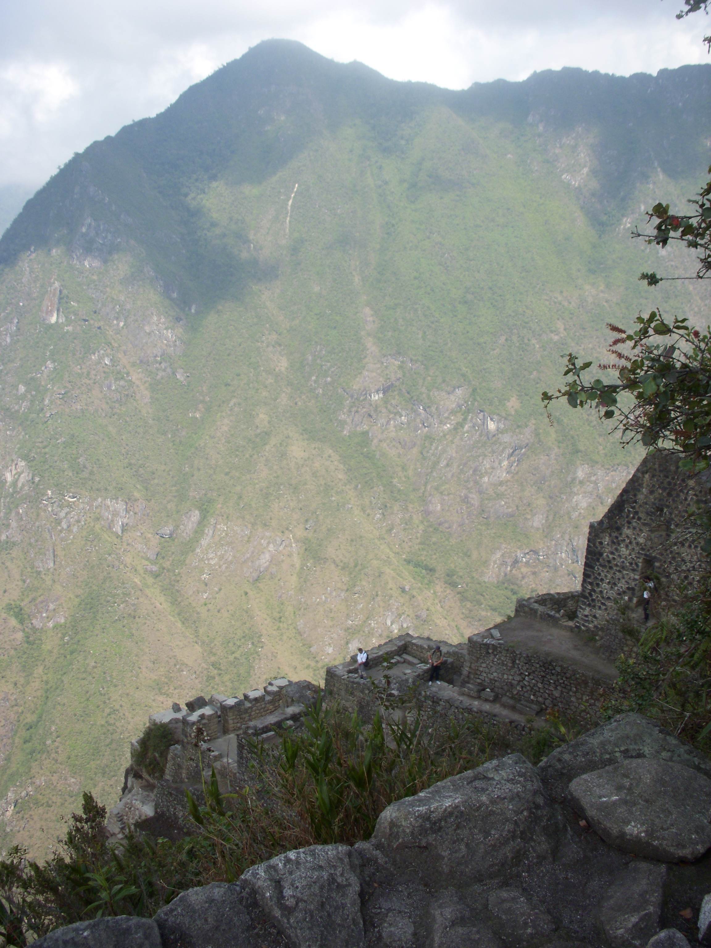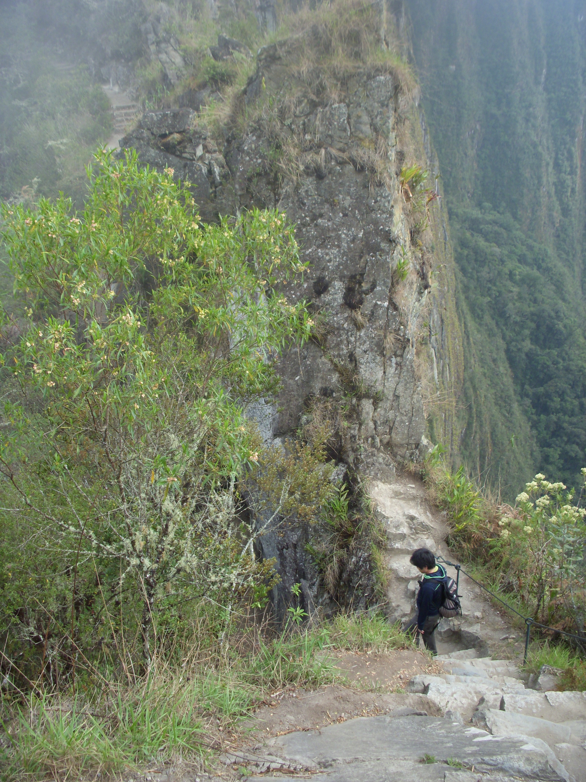 Sure enough, there were winding stairs that traversed up one side of Machu Picchu, and led out to the narrow path that connected Machu Picchu to Huayna Picchu. I was a little nervous at this point because even though there were cable railings for the steepest and narrowest parts, the railings were kind of low and I had to almost sit down in order to keep holding on. Nevertheless, we crossed over to Huayna Picchu without any huge issues.