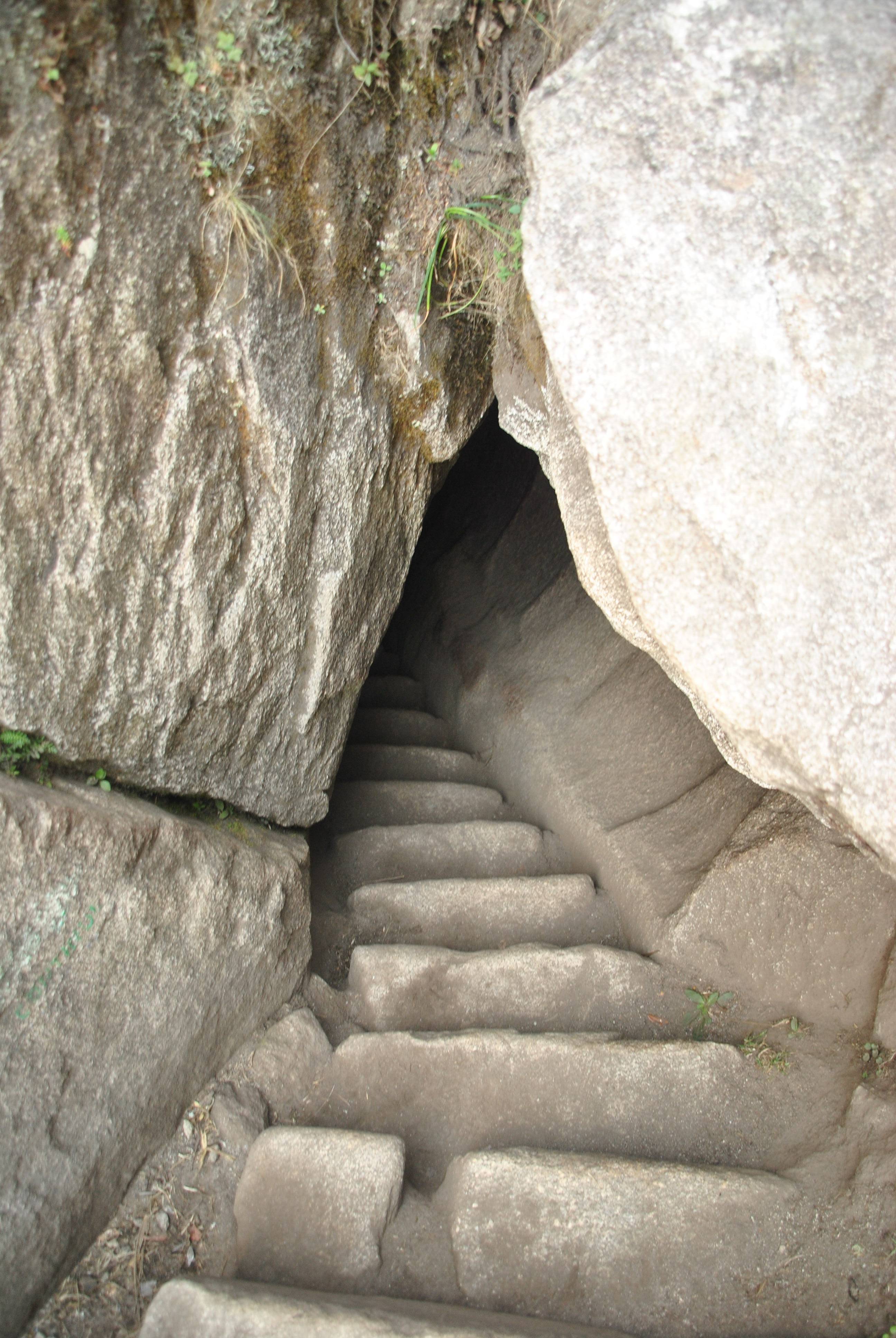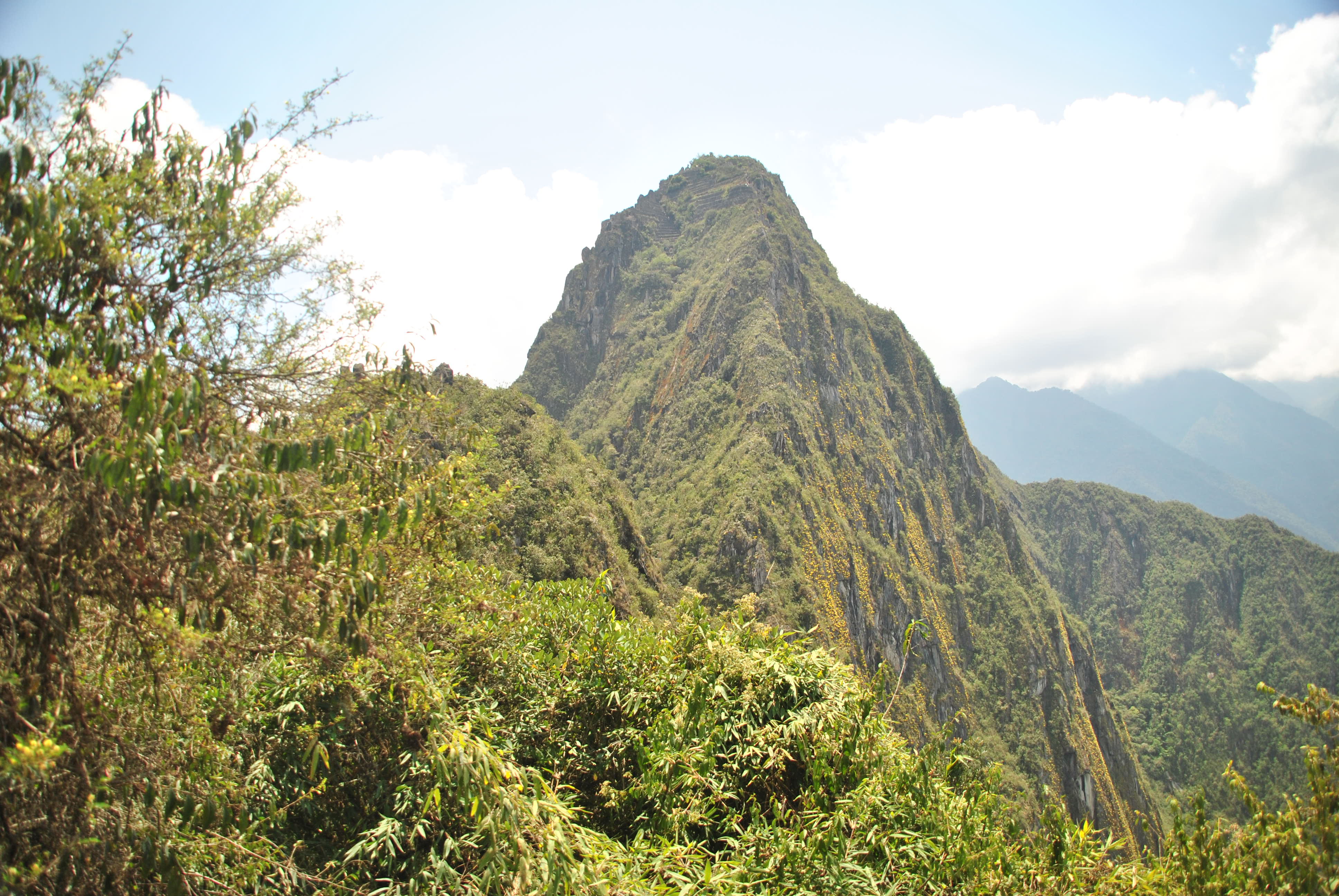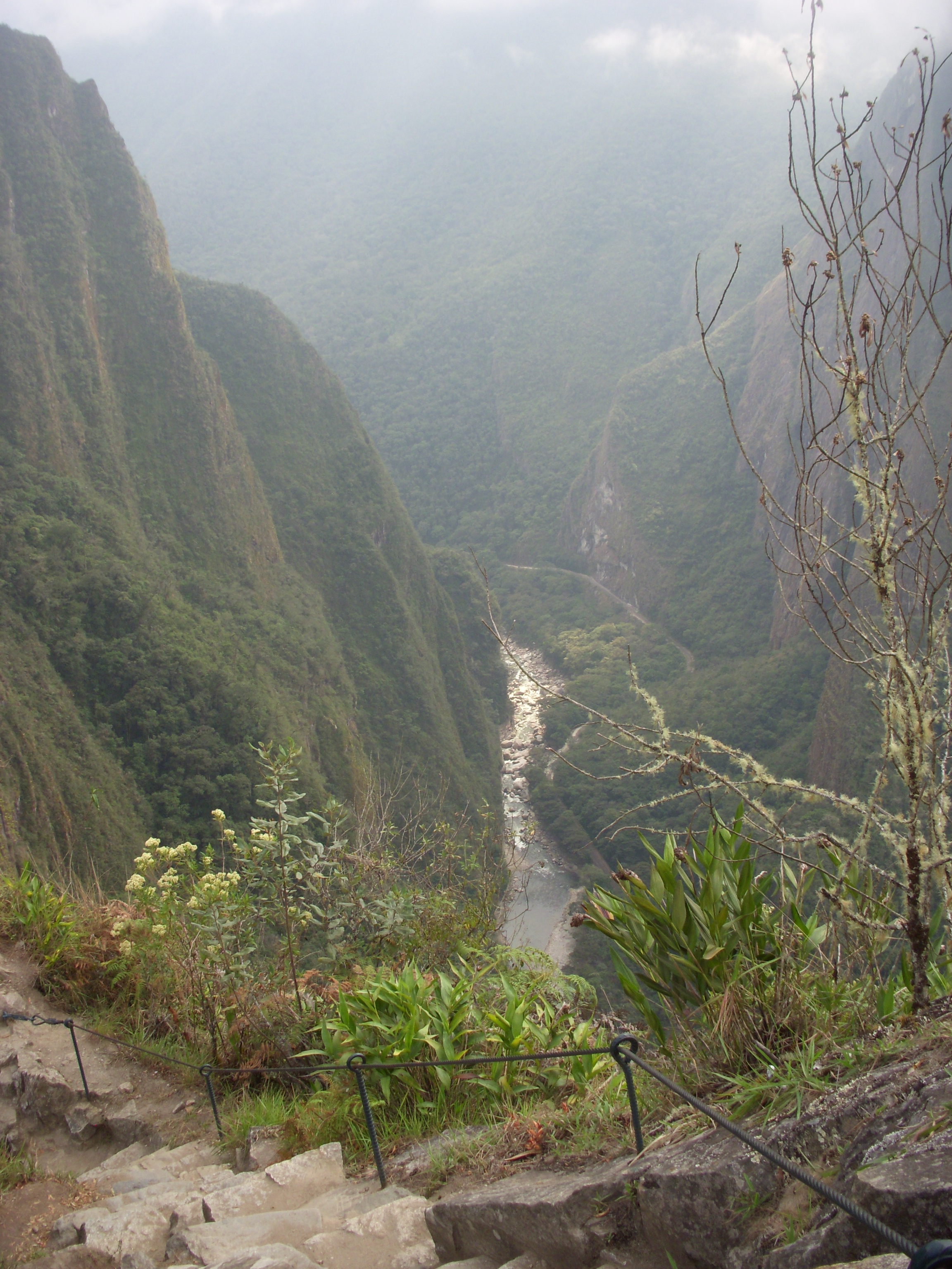 Sure enough, there were winding stairs that traversed up one side of Machu Picchu, and led out to the narrow path that connected Machu Picchu to Huayna Picchu. I was a little nervous at this point because even though there were cable railings for the steepest and narrowest parts, the railings were kind of low and I had to almost sit down in order to keep holding on. Nevertheless, we crossed over to Huayna Picchu without any huge issues.