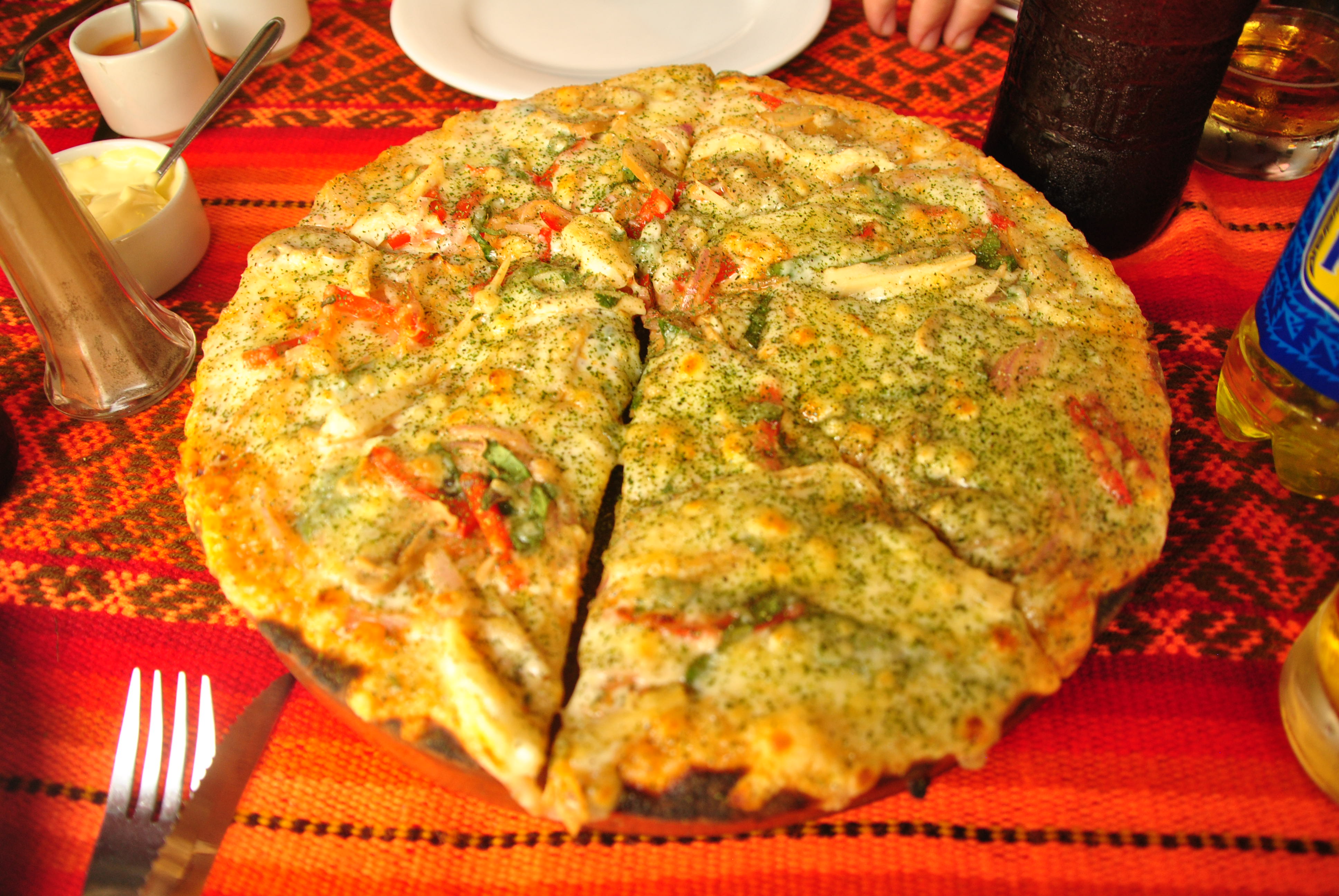 Overall we liked the pizza at this unnamed pizzeria. It’s definitely a low key joint, not as polished as Inka Wasi in terms of atmosphere and decor, and the menu wasn’t as refined. There was a lot of variety on the menu though, and the location couldn’t be beat. We were right on the main square and could people watch. It would be a nice place to hang out in the afternoon for a drink and some snacks. Prices were pretty reasonable, as our medium sized pie with all those toppings cost 32 soles, or about US$12. I’m not sure how helpful I’m being since I can’t give you the name or the exact address of the restaurant, but if you’re really interested in going just look for the Restaurant/Pizzeria/Bar sign on the side of the plaza closest to the bus station – it’s not too hard to find!
