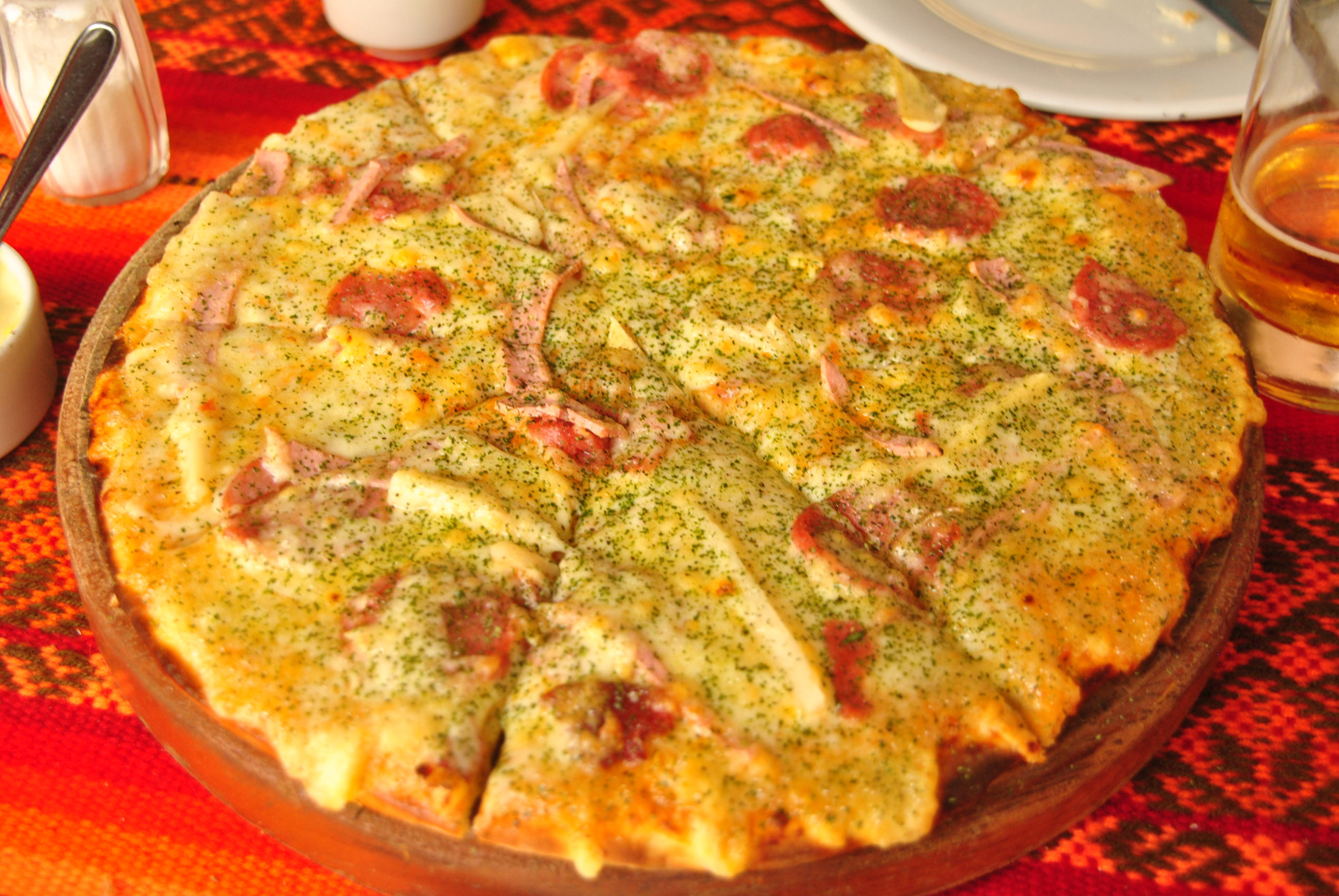 Machu Picchu pizza with sauce, ham, chorizo, hearts of palm, oregano, and cheese