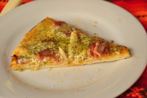 There were lots of different pizzas to choose from, and some of the combination of toppings sounded pretty interesting. We ended up choosing, appropriately enough, the Machu Picchu pizza, which was topped with sauce, ham, chorizo, hearts of palm, oregano, and cheese. The first pizza they brought us, however, was not what we ordered, though we didn’t figure that out until after we each taken a bite of our slices. Oops! They had given us a veggie pizza by mistake, which had peppers and onions on it. We probably should have realized right away because there were peppers and no meat, but we thought maybe the meat would be underneath all the cheese. They were really nice about the mix-up though, and let us finish eating our slices while they fired up the correct pizza for us.