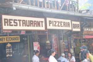 After we took the bus down from Machu Picchu, we decided to grab a quick lunch before we had to catch our train to Cusco. The main square is right by the bus station in town so we went there to look for a place to eat. There are lots of restaurants to choose from, but there are always people standing outside each restaurant waving menus around, trying to get you to go in. It’s kind of annoying because we wanted to look at menus first before we decided where to eat, and it was hard when you’re constantly being accosted by people trying to get you to go in. We ended up deciding on pizza, so we actually went into the only restaurant where no one bothered us. I’m not sure exactly what the name of this restaurant was, as the sign above the door just said Restaurant/Pizzeria/Bar.