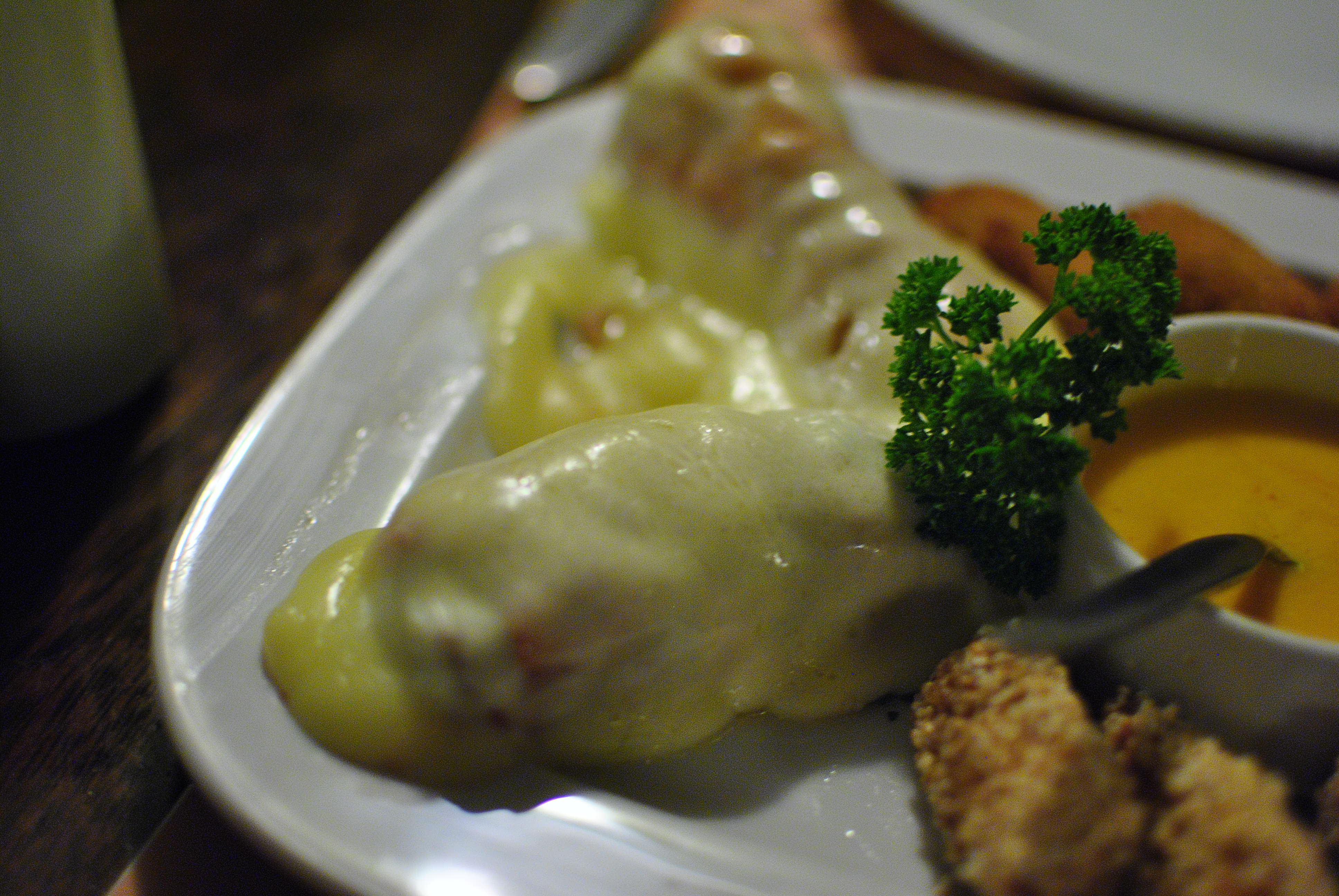 The platter came with stuffed chili peppers, kiwicha chicken fingers, alpaca brochettes, and quinoa croquettes. The chili peppers were stuffed with meat and weren’t spicy. They were smothered in a gooey, stringy cheese that was similar to mozzarella. I was a bit nervous when I saw all the cheese, since I’m usually not a fan, but when it was melted over the chili pepper it worked well and added a nice richness and saltiness.