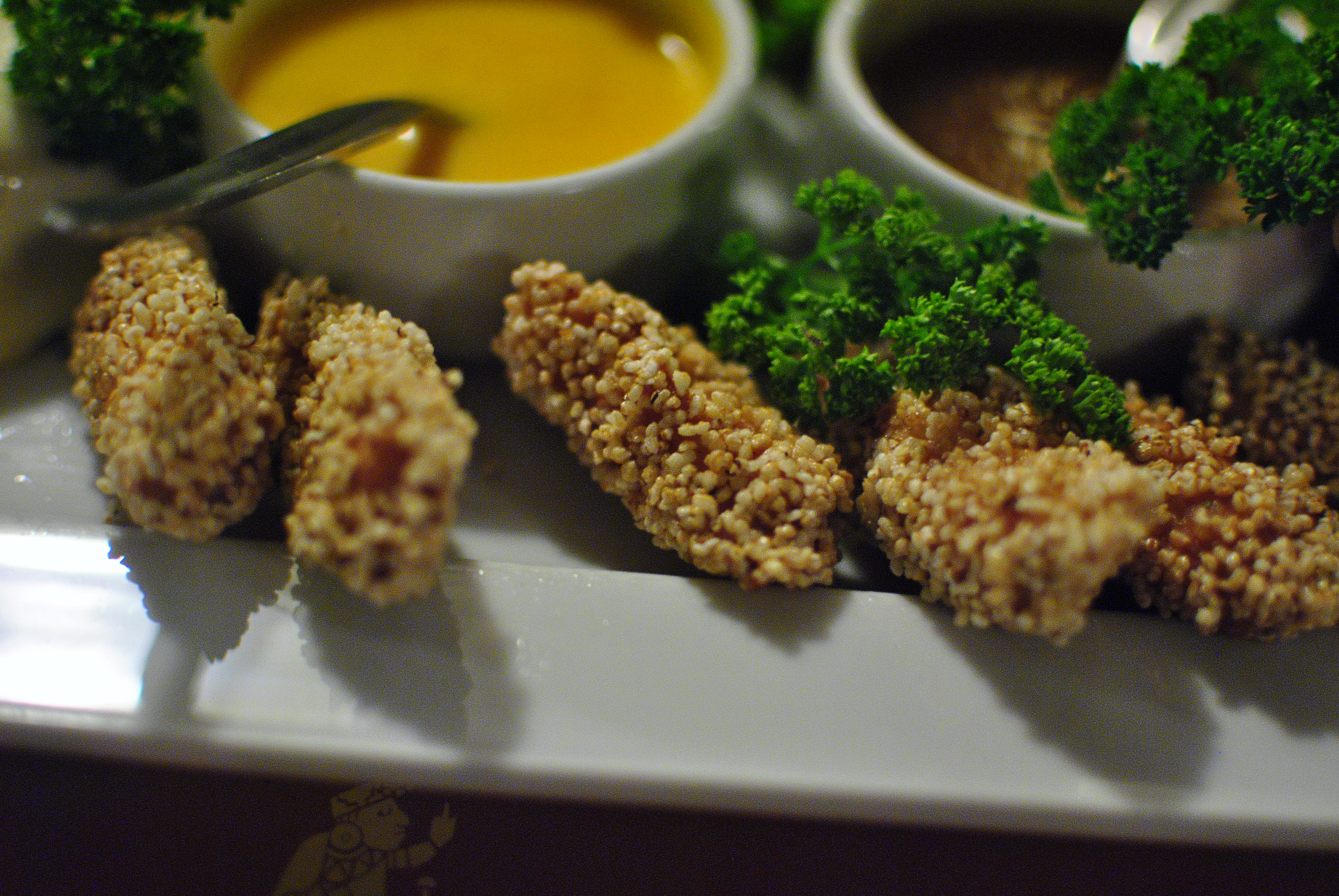 The kiwicha chicken fingers were strips of chicken coated in kiwicha, or amaranth seeds. The seeds have a similar flavor and texture to sesame seeds and provided a good crunch. The chicken strips were kind of thin so they were a little dry but we remedied that by dipping them into the accompanying sauces.