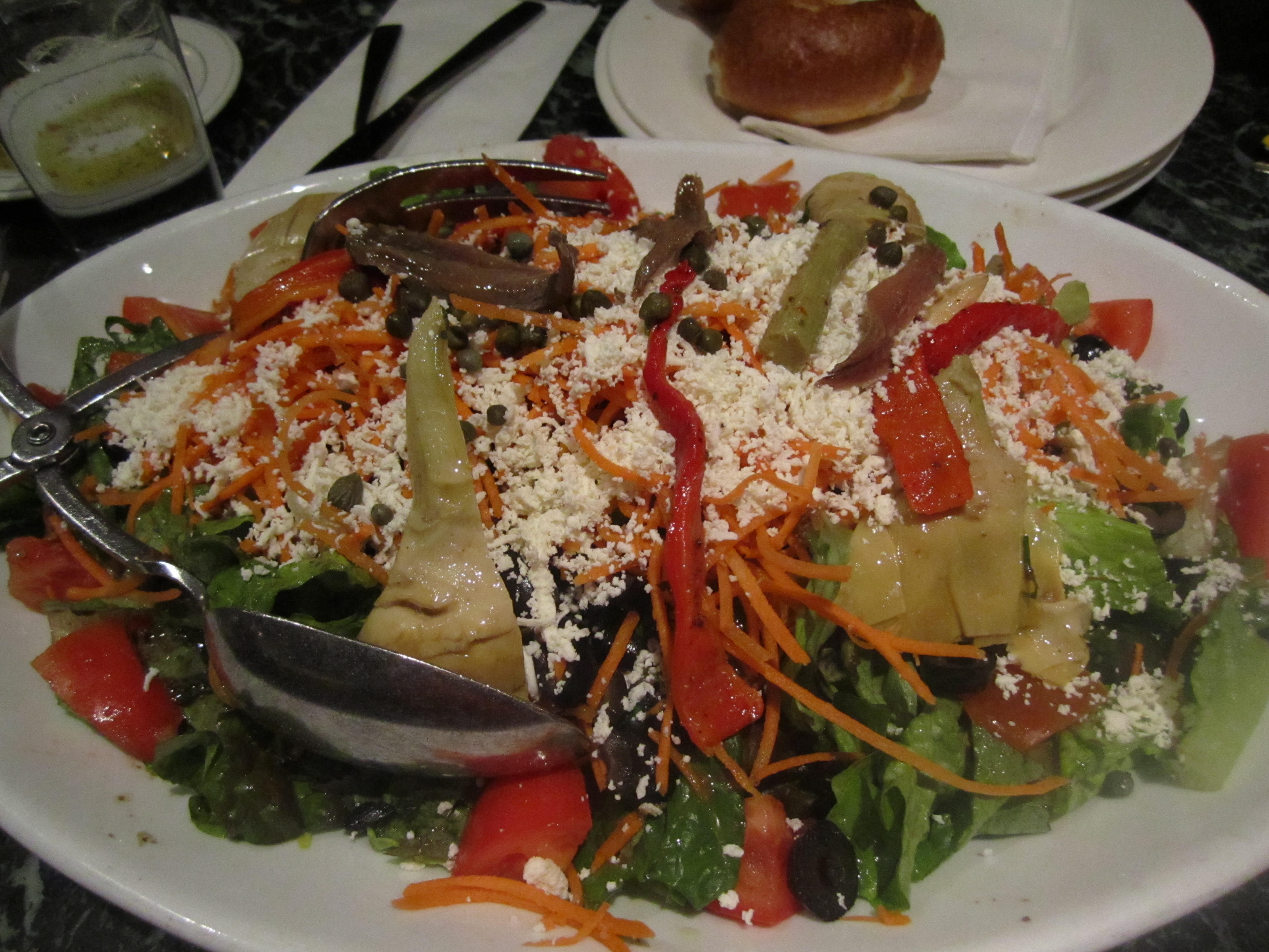 We decided to split a salad, pasta dish, and a pizza. The salads and pastas can be ordered either individually or in a family style portion. We asked our waitress if the individual portions could be split between the three of us, and she recommended that we get a family sized salad and an individual pasta, since we were also getting a large pizza to share. After we placed our order, we were brought a basket of rolls to munch on. The bread had a nice crispy crust and a soft, chewy interior. Pretty tasty, and a nice surprise since you don’t always expect pizza joints to bring you bread.