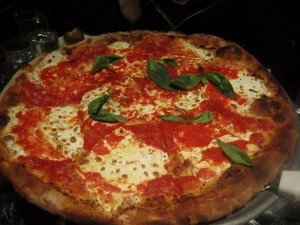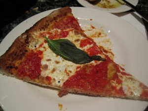 My first impression was that there was a decent amount of cheese on the pie, something that I always find lacking on most of these kinds of margherita pizzas (ie., Grimaldi’s and Lombardi’s). There was a lot of sauce though, which was slightly sweet and a bit tangy. Sometimes I wish I could get more cheese and less sauce, but overall it wasn’t too unbalanced. I did like the big leaves of fresh basil scattered on top.