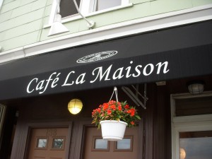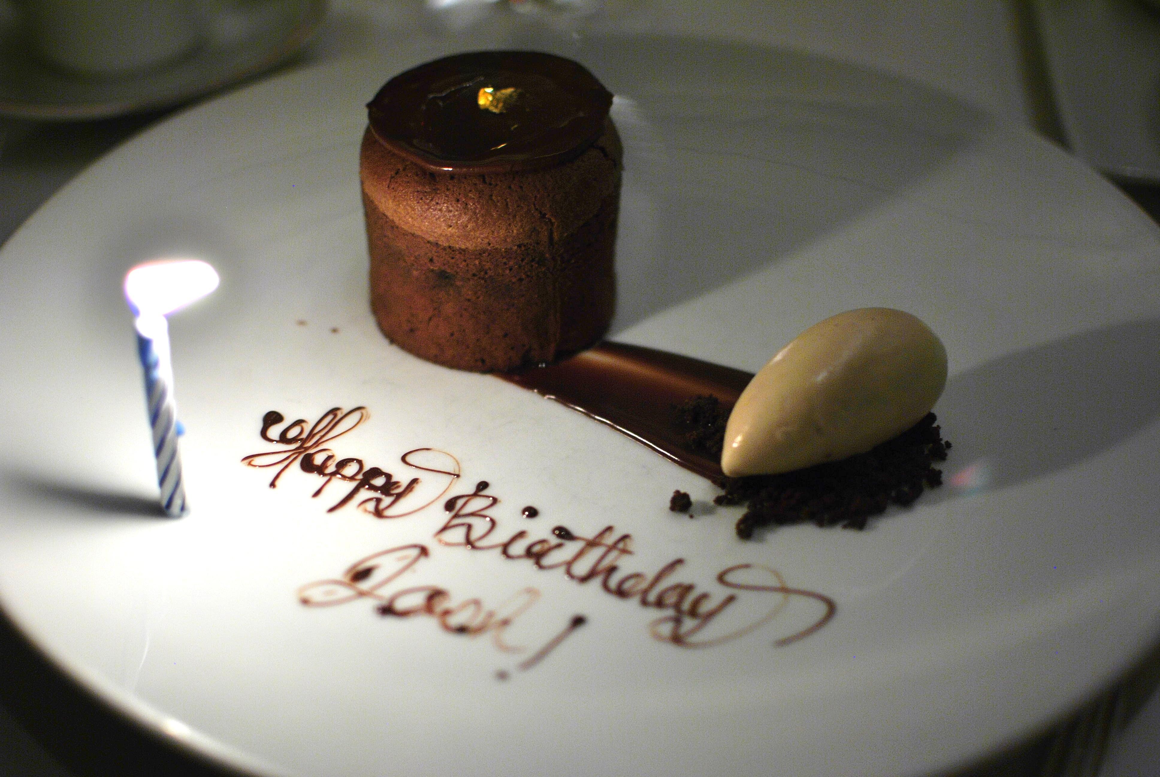 For dessert, we ordered the special of the evening, the Grand Marnier souffle. When they came with our dessert, however, they also brought Josh an additional molten chocolate cake with a candle in honor of his birthday. They even wrote “Happy Birthday Josh” on the plate, which is I guess why the woman on the phone asked for his name when she confirmed our reservation. It was a very nice gesture, and though we were both pretty full at this point, we gobbled up the cake. It was dark and rich with a warm, gooey center, just as you would expect, and the accompanying coffee ice cream was a good match.
