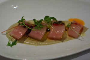 The lobster bisque was topped with a tarragon foam and had a few english pea gnocchis at the bottom. The foam really didn’t do much for us, but the gnocchis were fabulous, with a light and creamy texture. The bisque itself was full of lobster flavor, however, it was much thinner and lighter than most bisques we’ve had. It didn’t seem like they used much cream in it, if at all. Some people might prefer that, but for us, we like our bisques to be a little bit thicker and more creamy. I think the cream helps the flavor coat your mouth and gives the soup a certain velvety richness. With this particular bisque, the flavor was intense at first sip but didn’t linger. We also couldn’t really use the bread to sop up what was left at the bottom of the bowl because the soup was so thin, which was a bit disappointing since that’s usually one of our favorite parts. Nevertheless, the bisque wasn’t bad, it just wasn’t to our personal preference.
