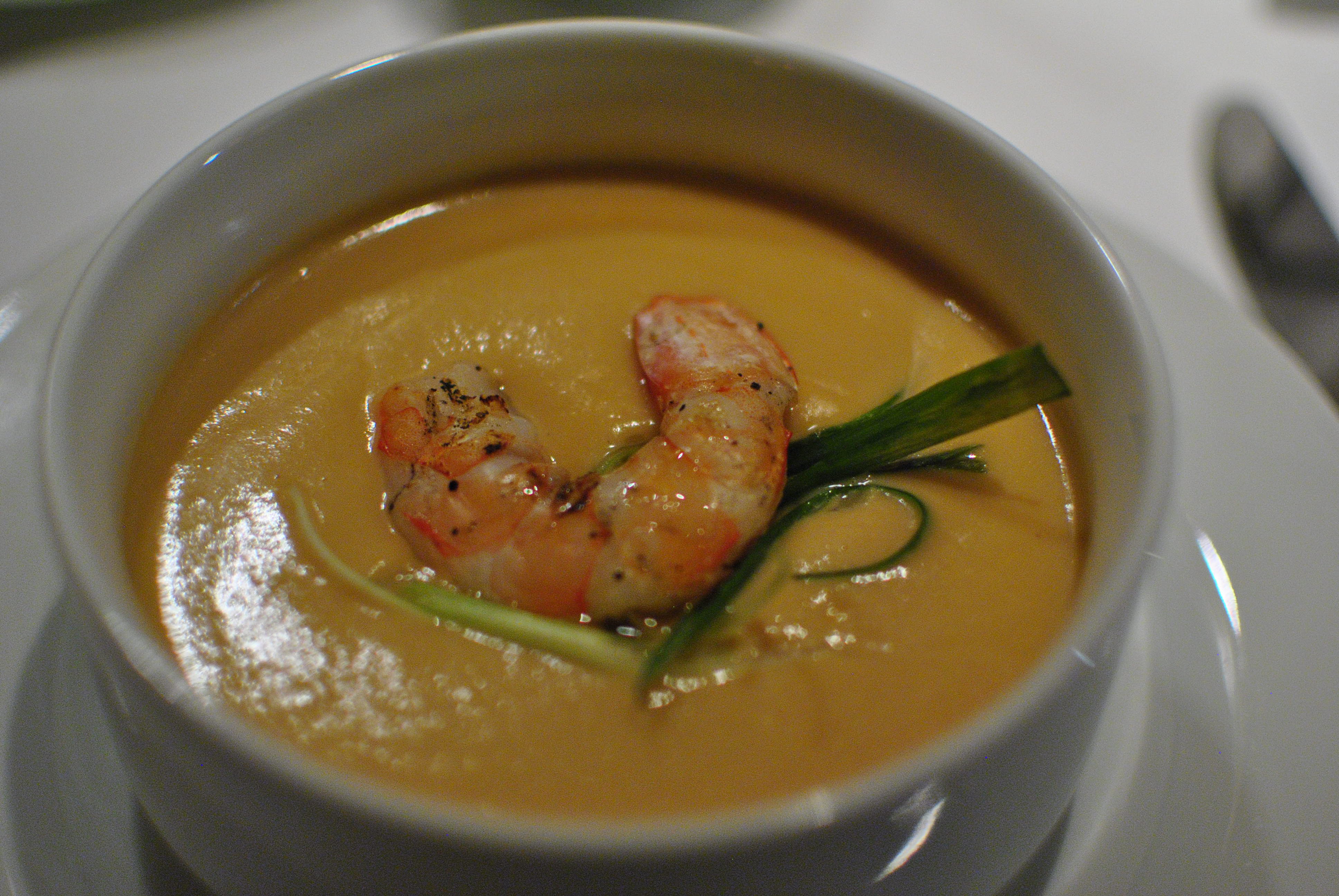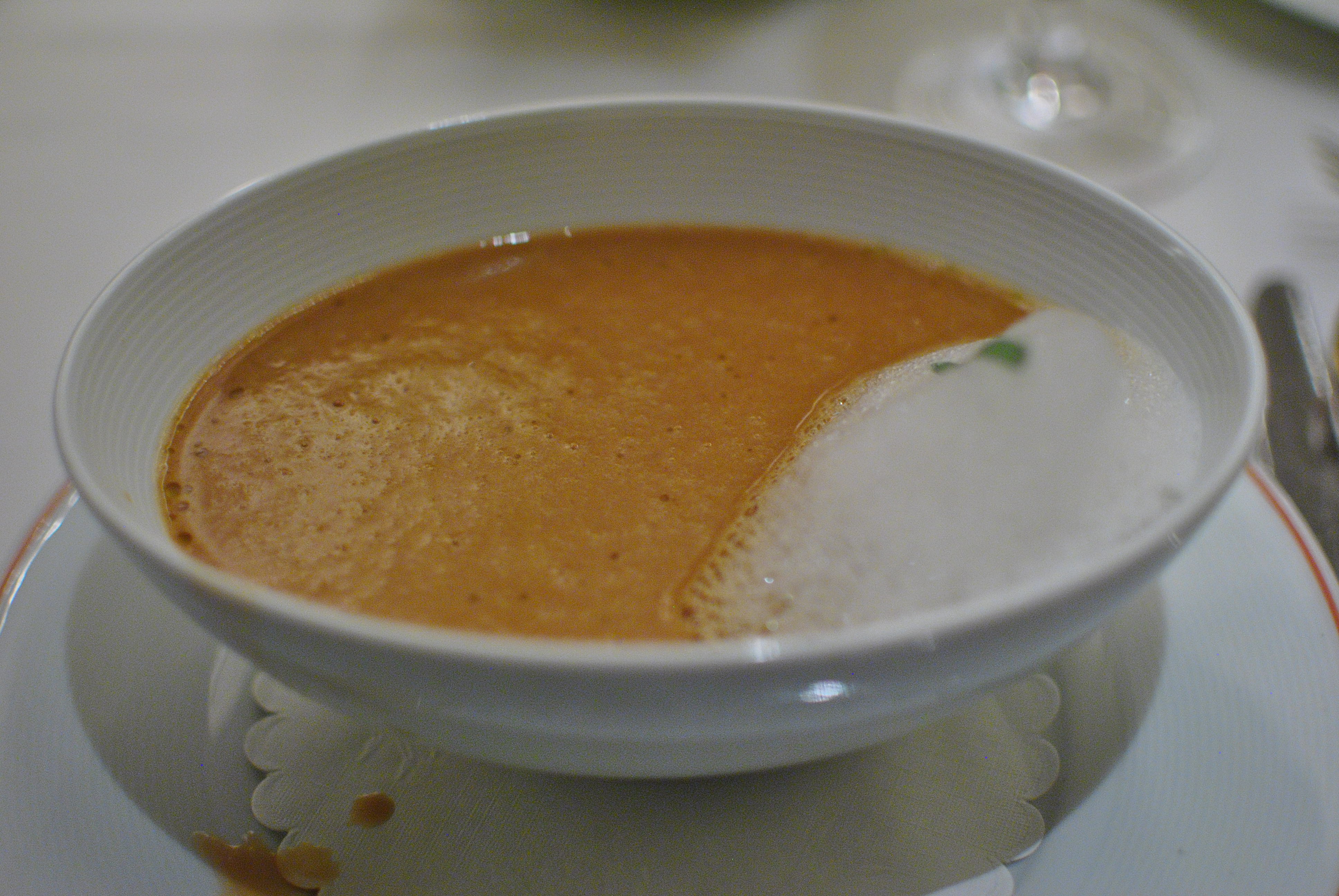 For our appetizers, we ordered the capon terrine and a special of the evening, the lobster bisque. The capon terrine was hard for us to resist because it featured black truffles and foie gras, as well as puy lentils and an espelette (a type of pepper) jam. The presentation was visually stunning, with the different layers of the terrine clearly defined. The foie gras took center stage and I enjoyed the livery richness, although I prefer foie gras when it’s sauteed and creamy, rather than cold. Also, while we could see the black truffle layer, it actually didn’t impart too much truffle flavor, much to my disappointment. Still, the capon was very tender, and all the components on the plate worked well when eaten together. I liked cutting off slices of the terrine and eating it with some crunchy toasts that accompanied the dish, providing some textural contrast. It was an interesting dish, though probably not something Josh or I would order again.