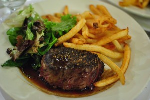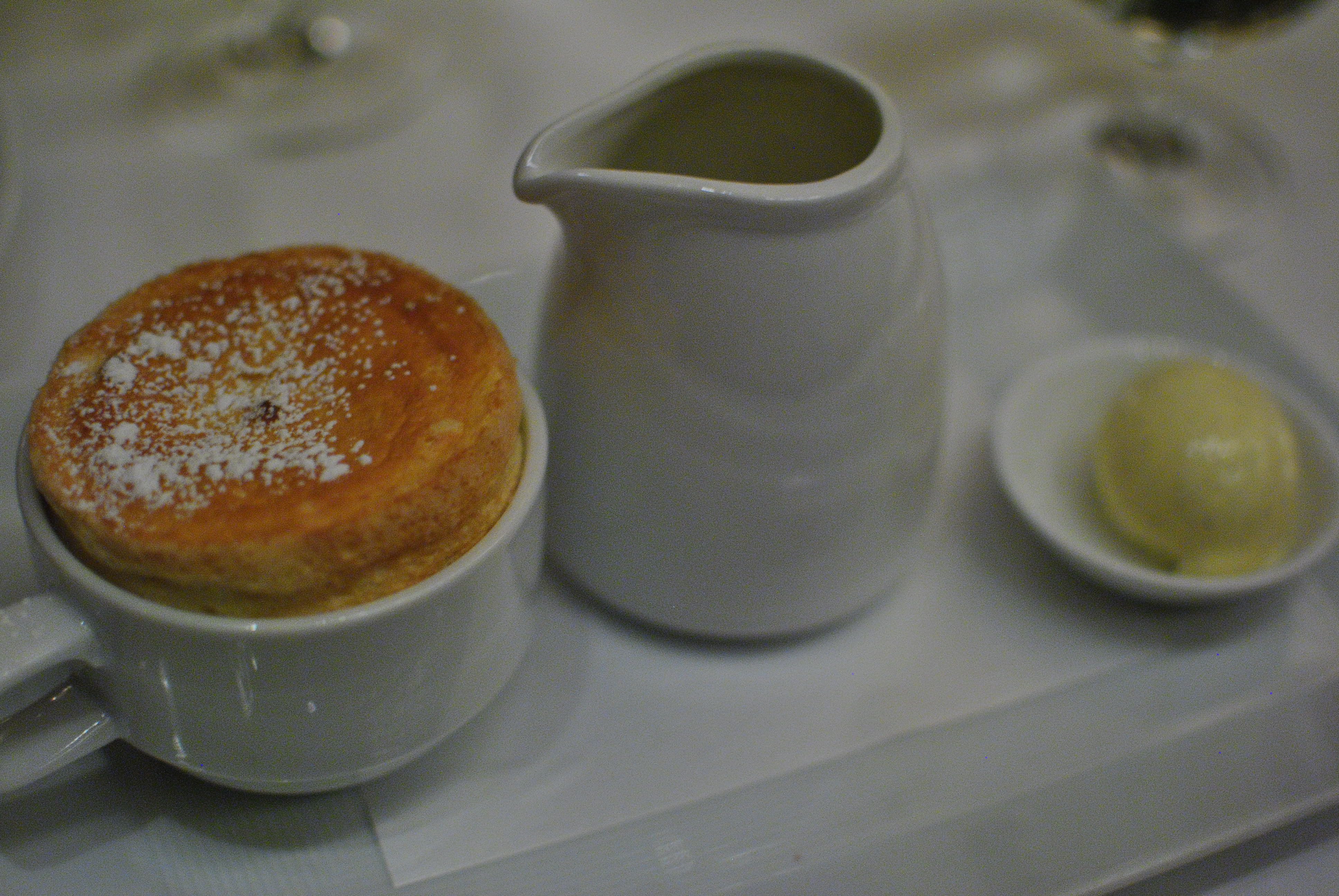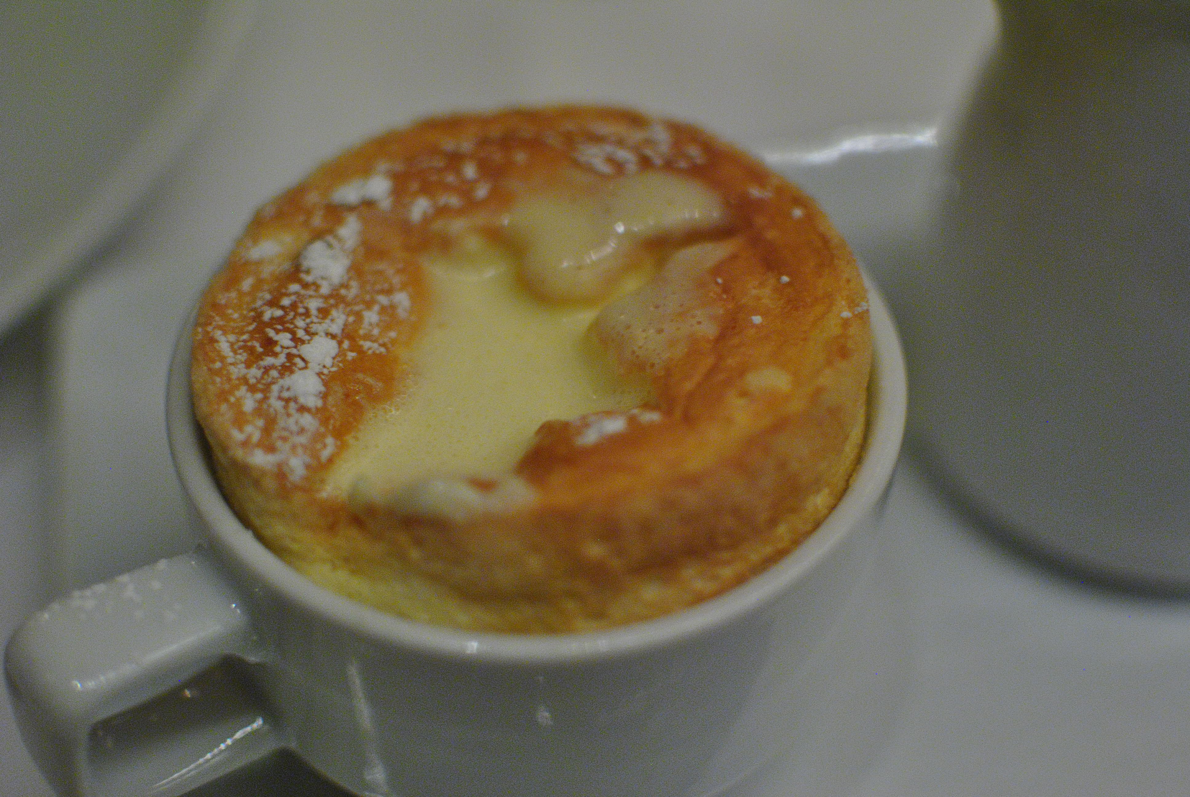 The Grand Marnier souffle was served with a small pitcher of creme anglaise and a scoop of vanilla ice cream. It was light and fluffy, just like a good souffle should be, and the flavor was spot on. We’ve had Grand Marnier souffles before and they usually just taste like a vanilla souffle with maybe a hint of orange. This particular souffle actually tasted like Grand Marnier, right down to the slight bite from the alcohol. It wasn’t too sweet, and we liberally poured the creme anglaise into the center, which gave it an extra boost. The ice cream in this case was unnecessary, as the souffle and sauce were more than enough to satisfy us.