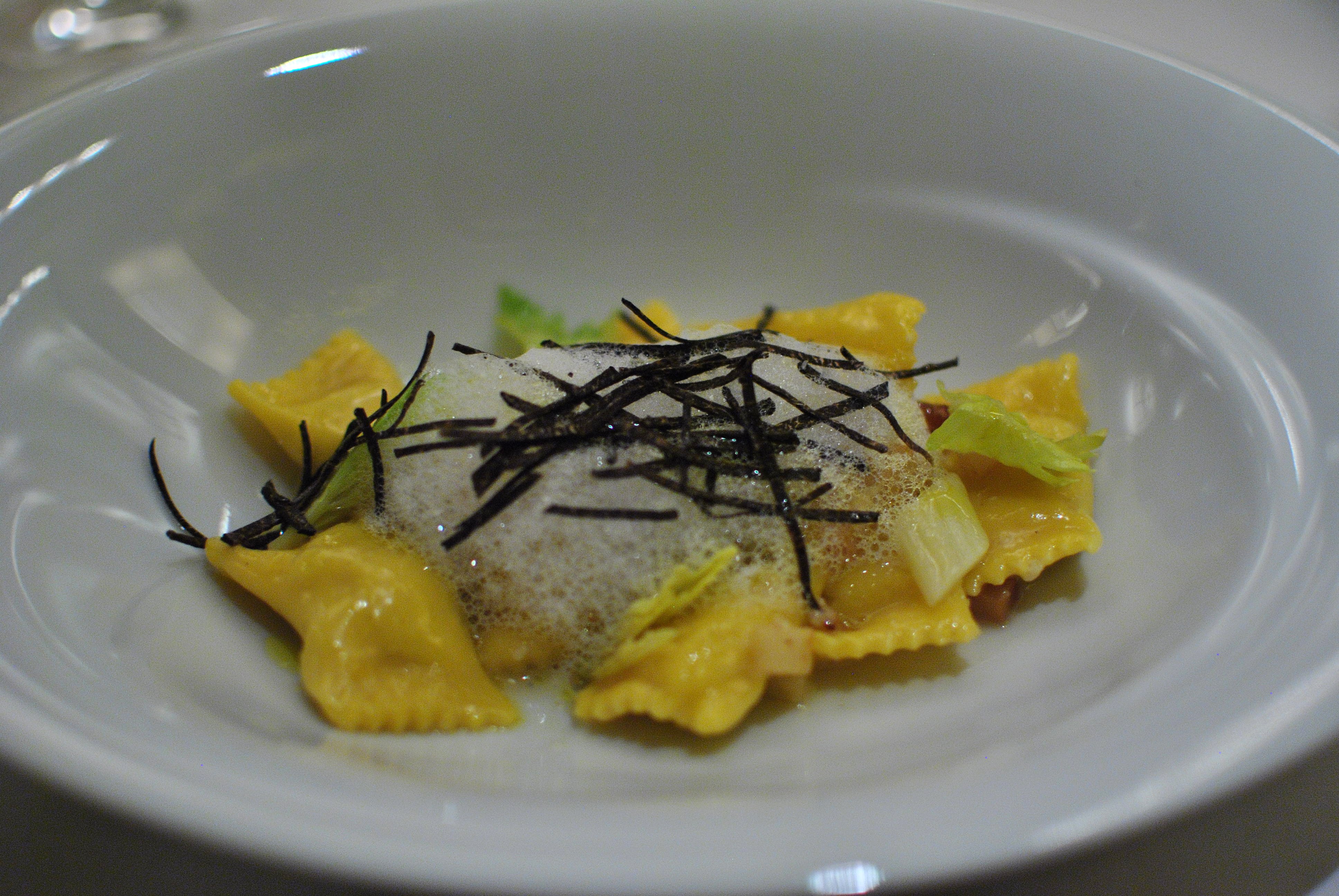 As good as the gnocchi were, our other pasta dish was even better. It featured agnolotti, which were little raviolis filled with pureed celery root. The filling was creamy and savory, and the agnolotti were topped with soft chestnuts, celery leaves, and black truffles. Again, the black truffles weren’t as flavorful as I had hoped, but the dish was absolutely fabulous. It was rich and flavorful, with lots of butter in the sauce, but we couldn’t get enough of it. The celery leaves lightened the dish just a tad, and we were scraping the sauce from the bowl with pieces of bread. This was our favorite dish of the evening.