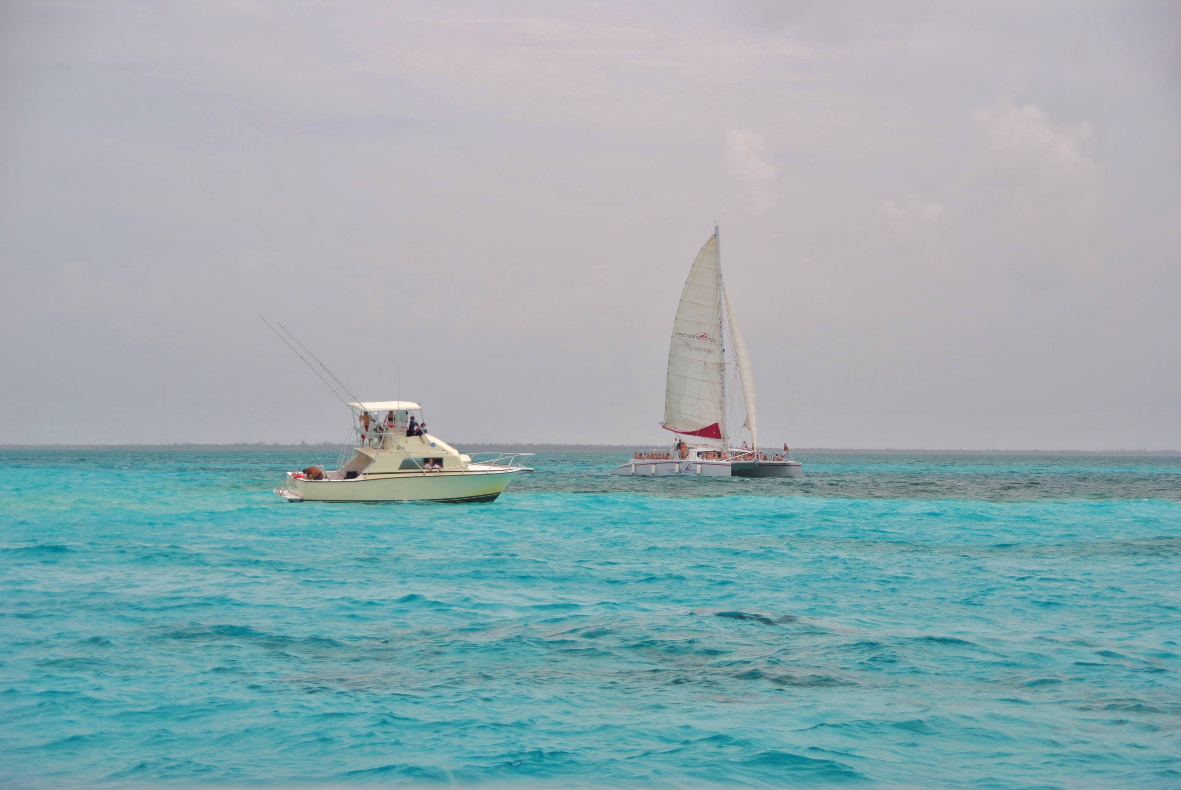 We were picked up in vans by people from Red Sail Sports, the company that ran our boating excursion. We drove a little ways to a dock on the bay side of the island which was the launching point for the boat.  After we signed our waivers (which always makes me a bit nervous!), we boarded the ship. It took about 45 minutes to get to our first destination, a coral reef where we could snorkel for a bit. The boat ride itself was pretty relaxing – we enjoyed the breeze and took in the views. It was a bit overcast when we set off, but the sun started peeking out more when we got to our destination. The water there was crystal blue and just gorgeous.