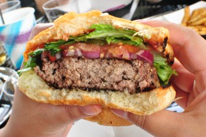 After a short while, our number appeared on the board so Josh and his dad went to pick up the food. We had all gotten the burger, though Josh added cheese to his. My burger certainly looked promising, with a huge, thick patty that was slightly charred on the outside, served with a puffy toasted bun, lettuce, tomato, red onion, and pickles.
