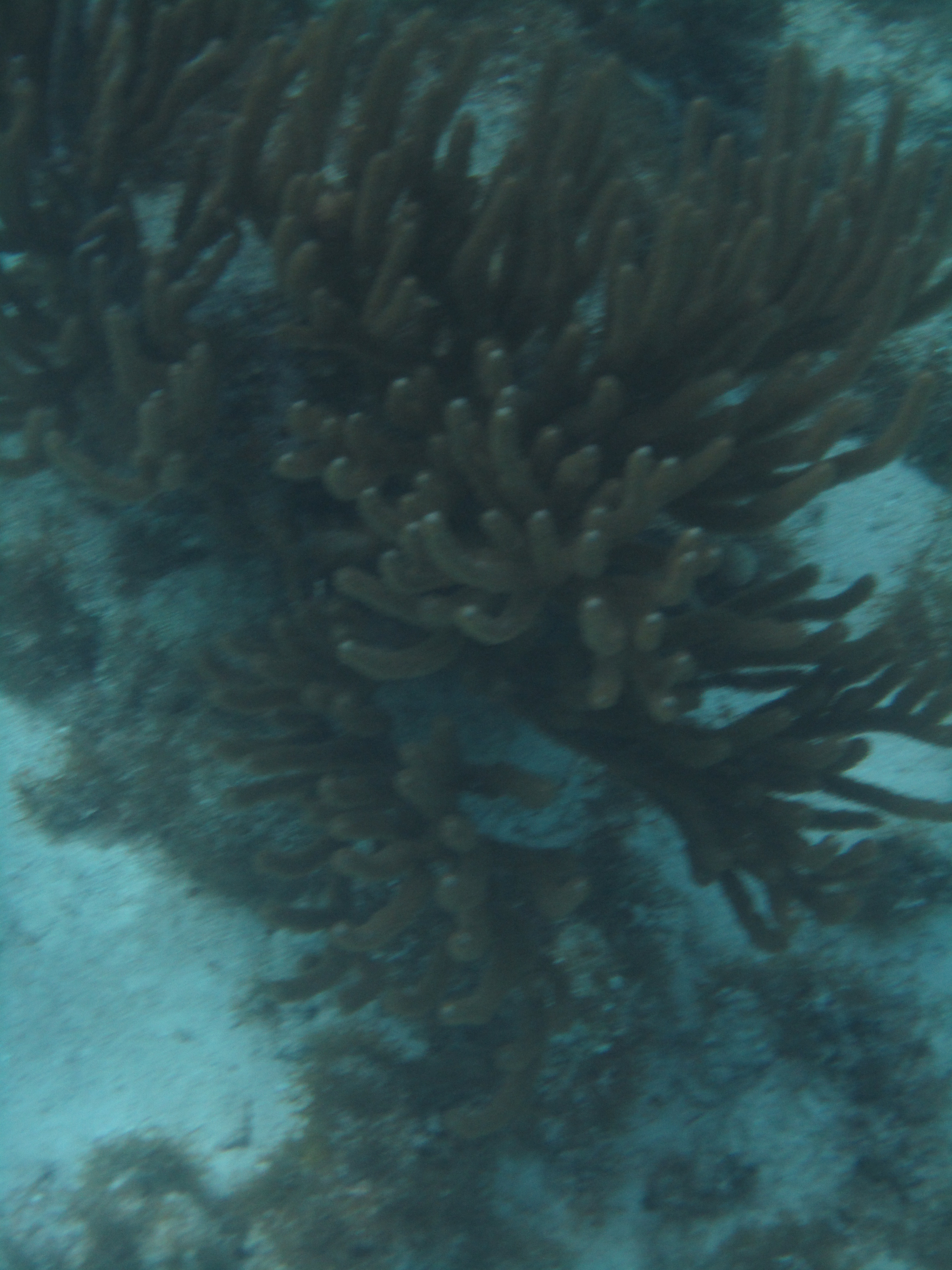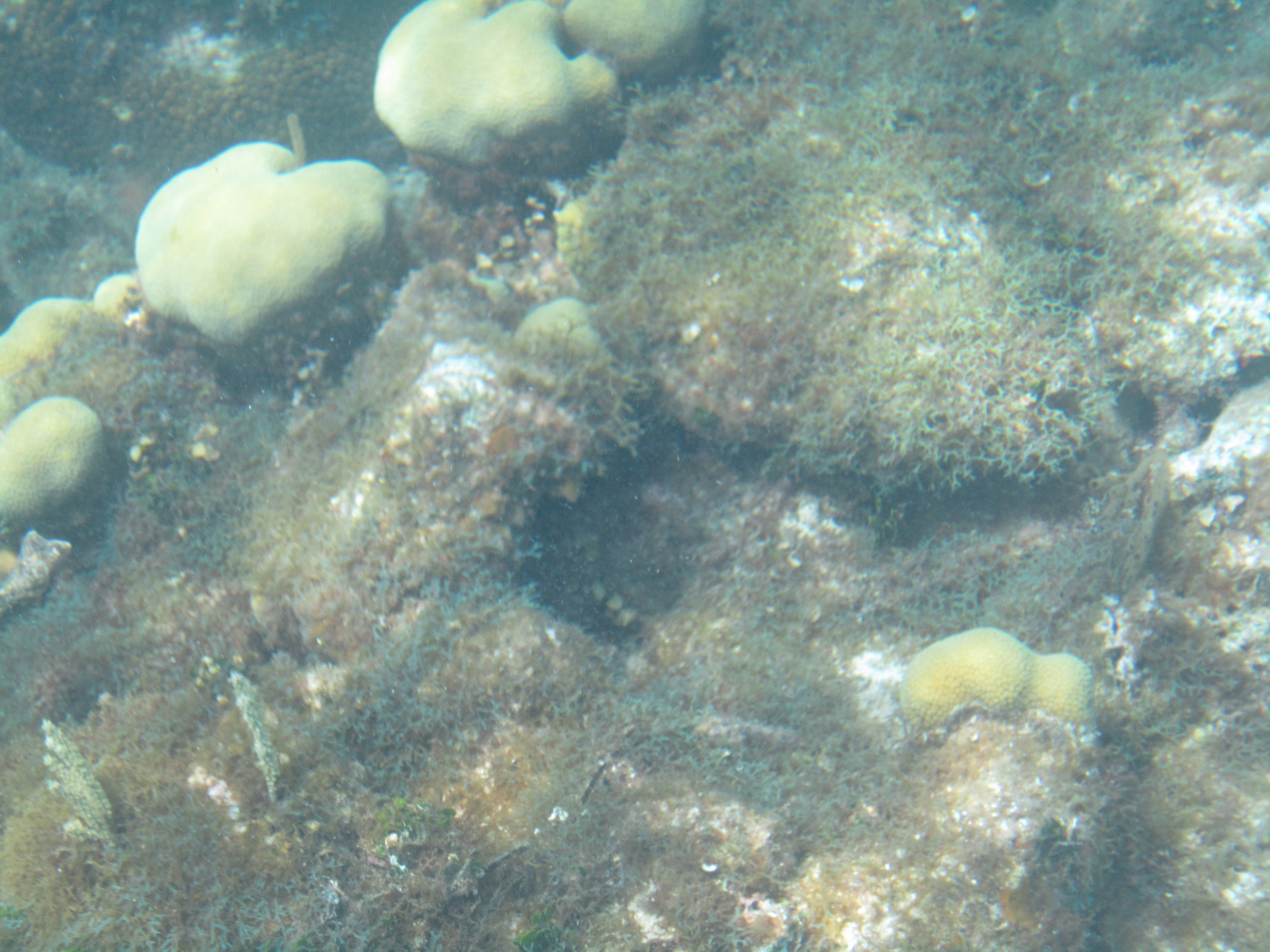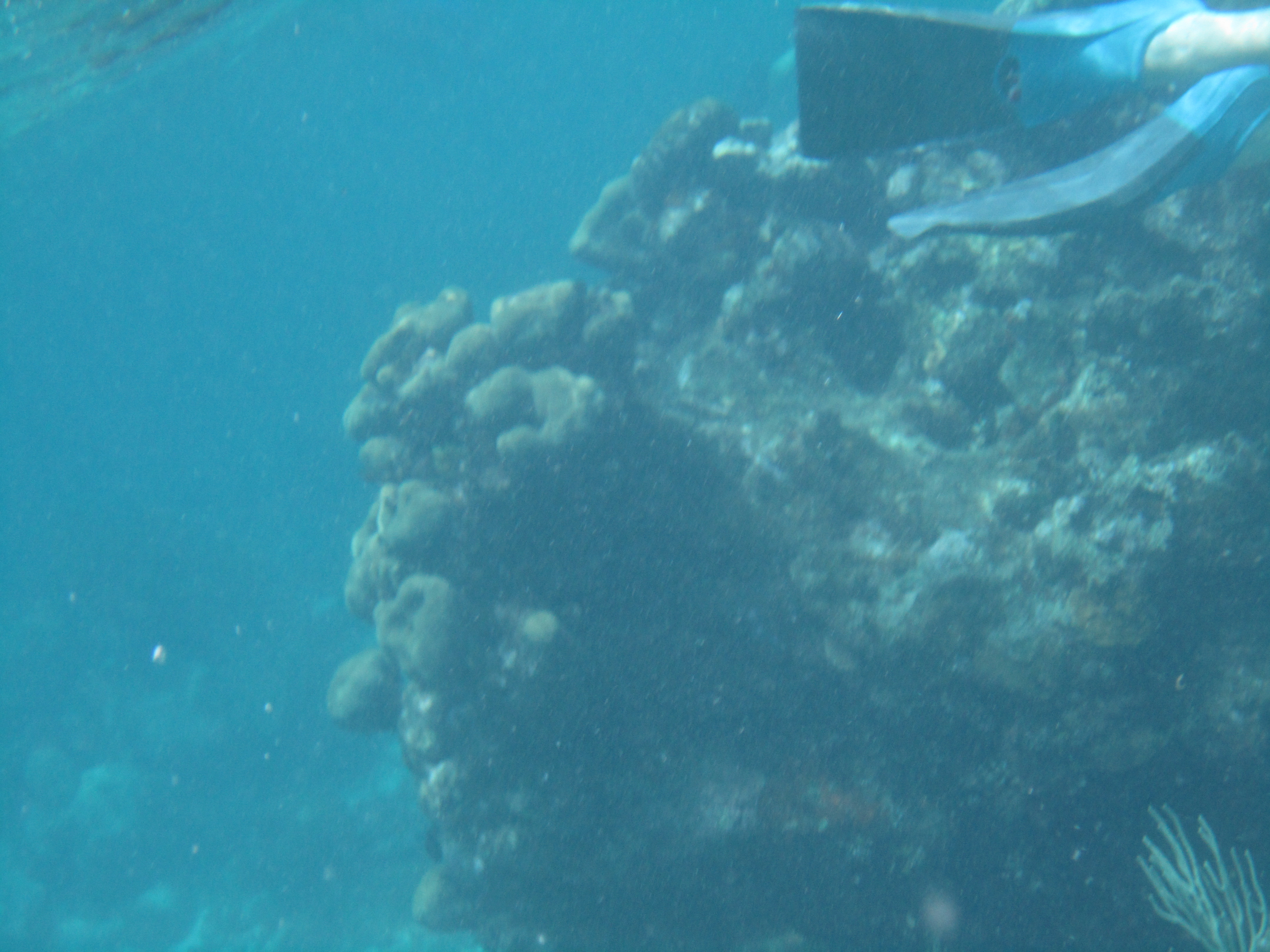 We donned our snorkeling gear (masks, snorkels, and flippers, plus a snorkeling vest for me) and went into the water. The waves were a bit rougher than I expected, considering how calm the water on the beach had been, so it took me a little while to get used to snorkeling again. We haven’t snorkeled since we were in the Galapagos, and I was a little rusty. I was also having trouble getting a good seal with the snorkel, and ended up with mouthfuls of salt water – blech! But once I got in the groove, I could see some of the coral formations and lots of cool plant life. There weren’t too many fish swimming around but we did see a few schools of small, colorful fish.