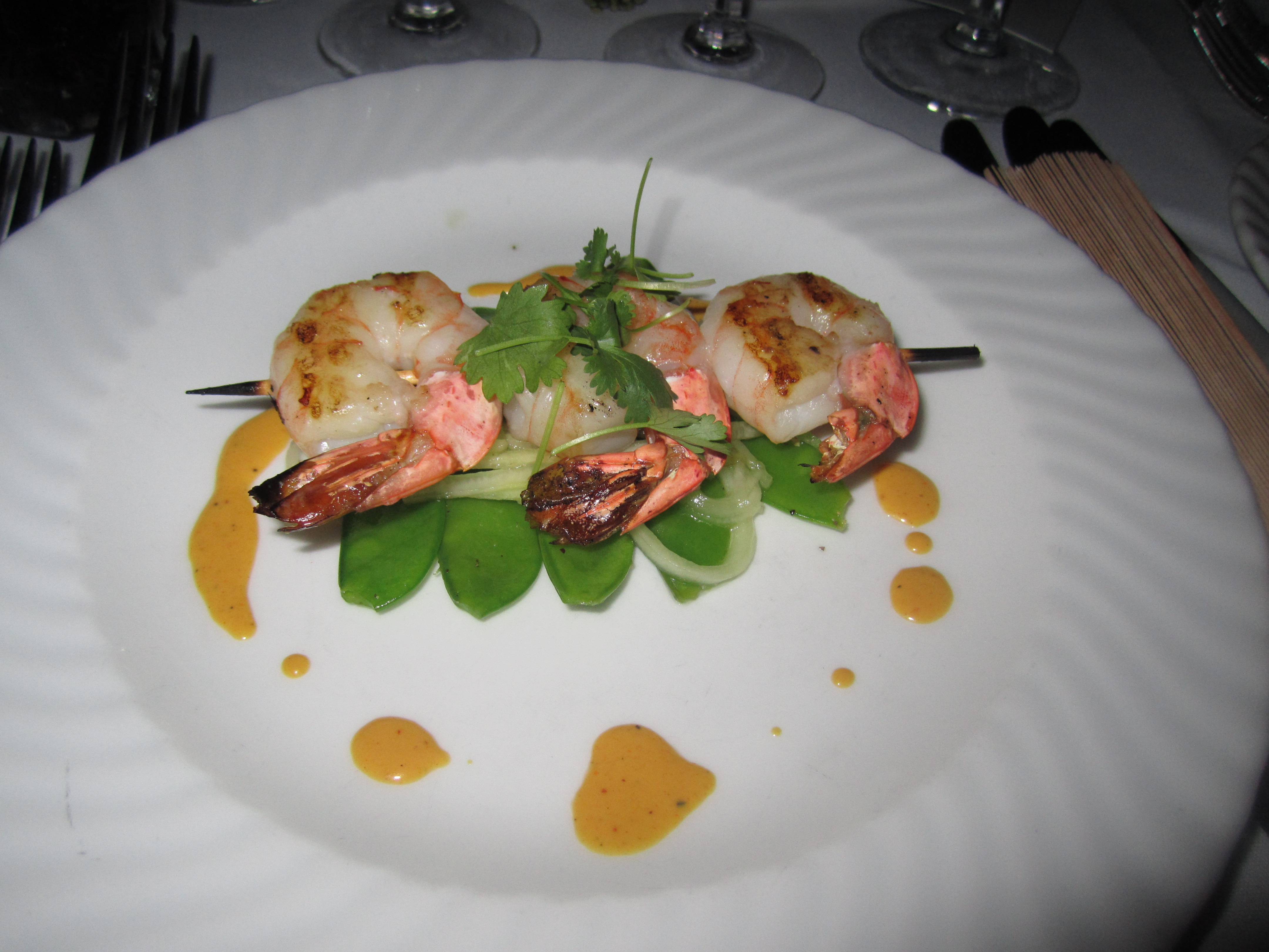 The appetizer was fire roasted shrimp on snow peas and cucumber noodles, served with a curry yogurt sauce.