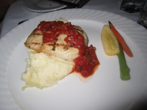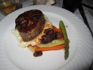For the entree, we had a choice of grilled tenderloin of beef with red wine reduction and wild mushroom ragu, pan seared mahi mahi with cumin spiced plum tomatoes, herb crusted chicken breast with exotic mushroom stuffing, or a vegetarian option. Each entree was served with buttery mashed potatoes and veggies. Josh and I split the grilled beef tenderloin and the pan seared mahi mahi.
