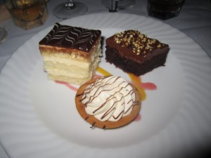 Dessert was an assortment of sweets, featuring a slice of chocolate fudge cake, a passion fruit coconut tartlet, and dobos torte (a Hungarian layer cake).