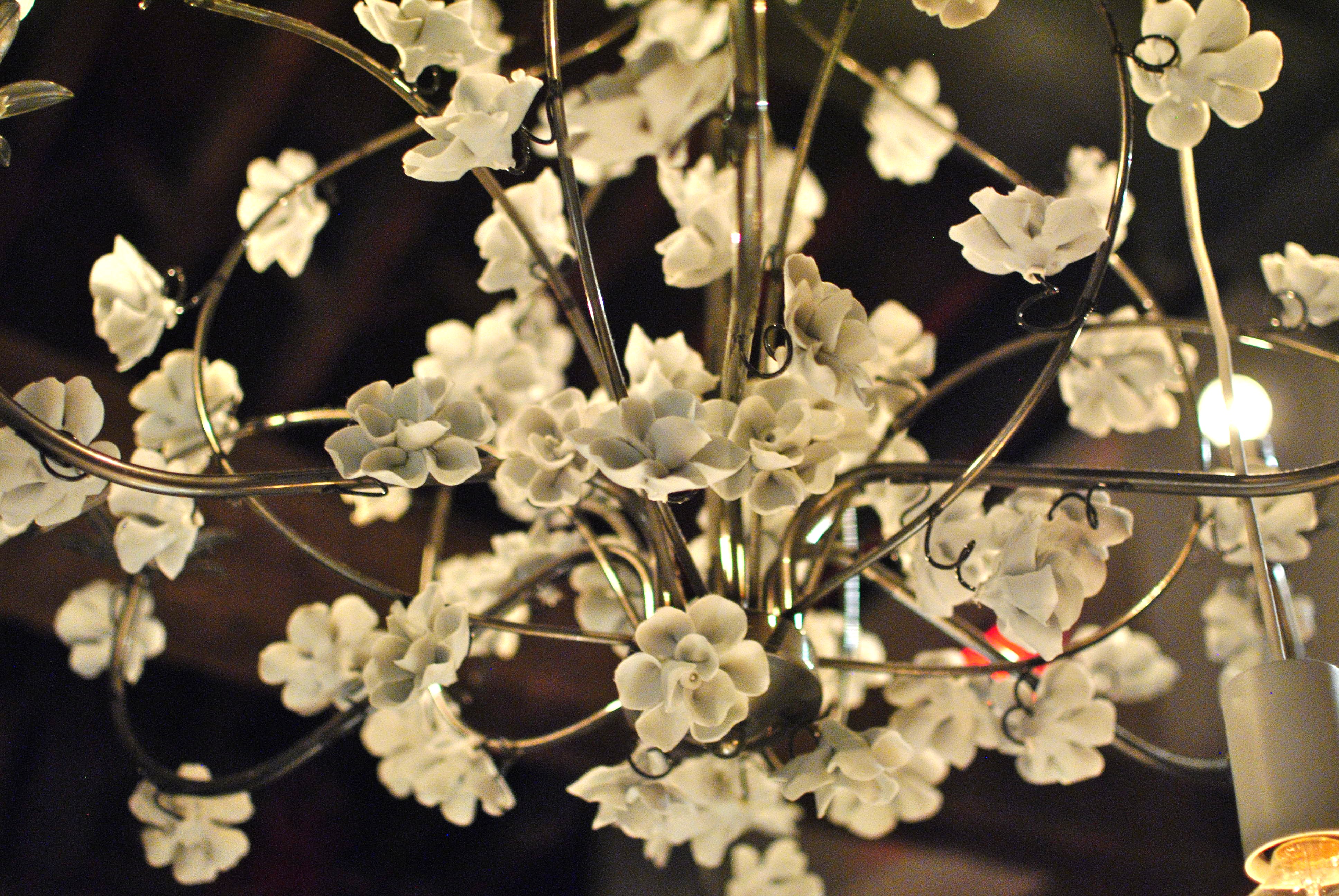 We were seated at a round table in the front corner of the main room, giving us a great view of the room and its modern decor. It’s pretty minimalist and kind of industrial, but also elegant and classy. Our table was made from knotty wood and sort of rustic, reminiscent of a tree trunk. I loved the chandelier above us, which was silver with white ceramic flowers all over.