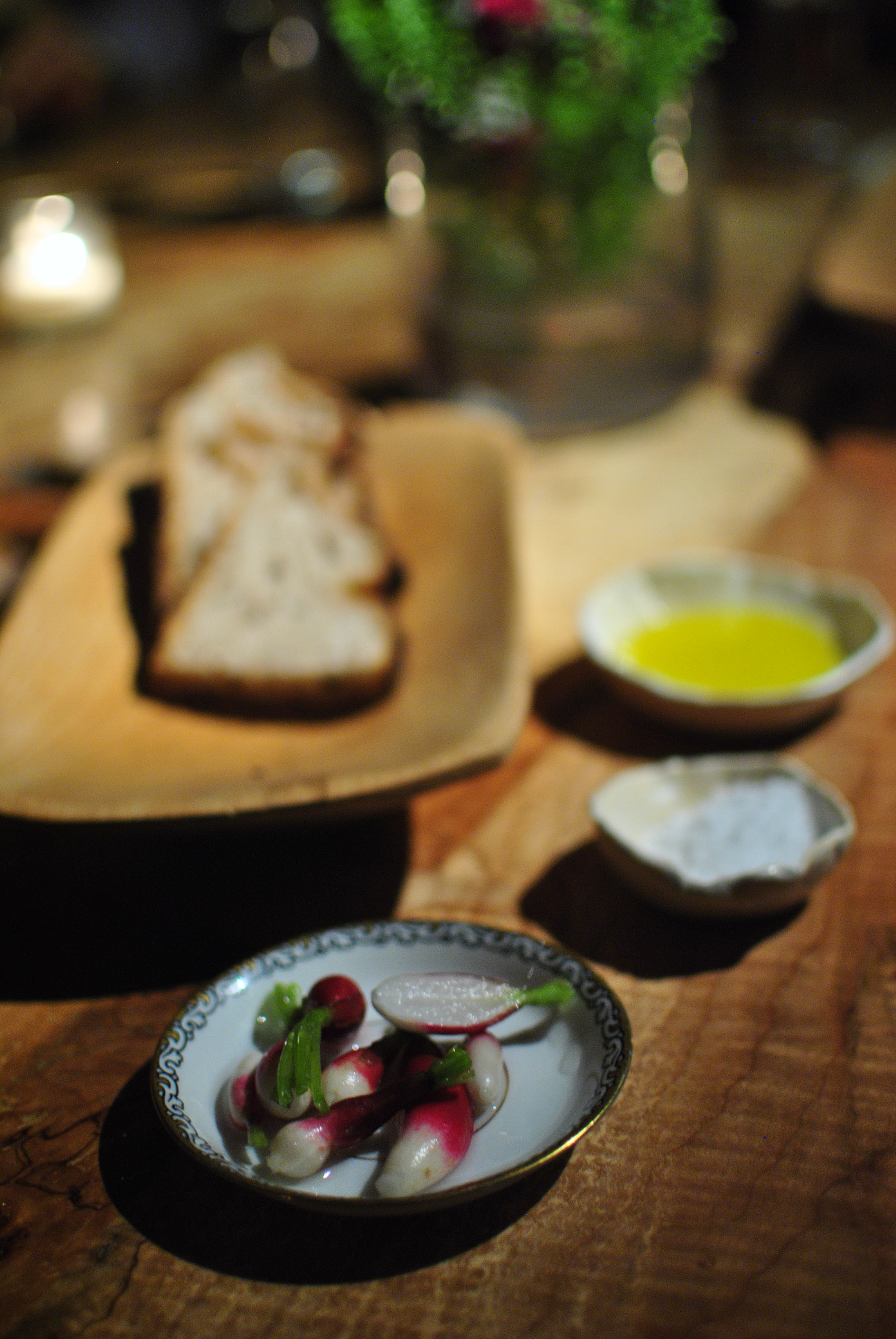 The meal started out with some slices of slightly sour rustic bread, olive oil, and french radishes. The bread was fine, if a bit standard, but I loved the radishes. They were fresh, crunchy, and not too sharp. We ate them whole with just a bit of salt sprinkled on top.