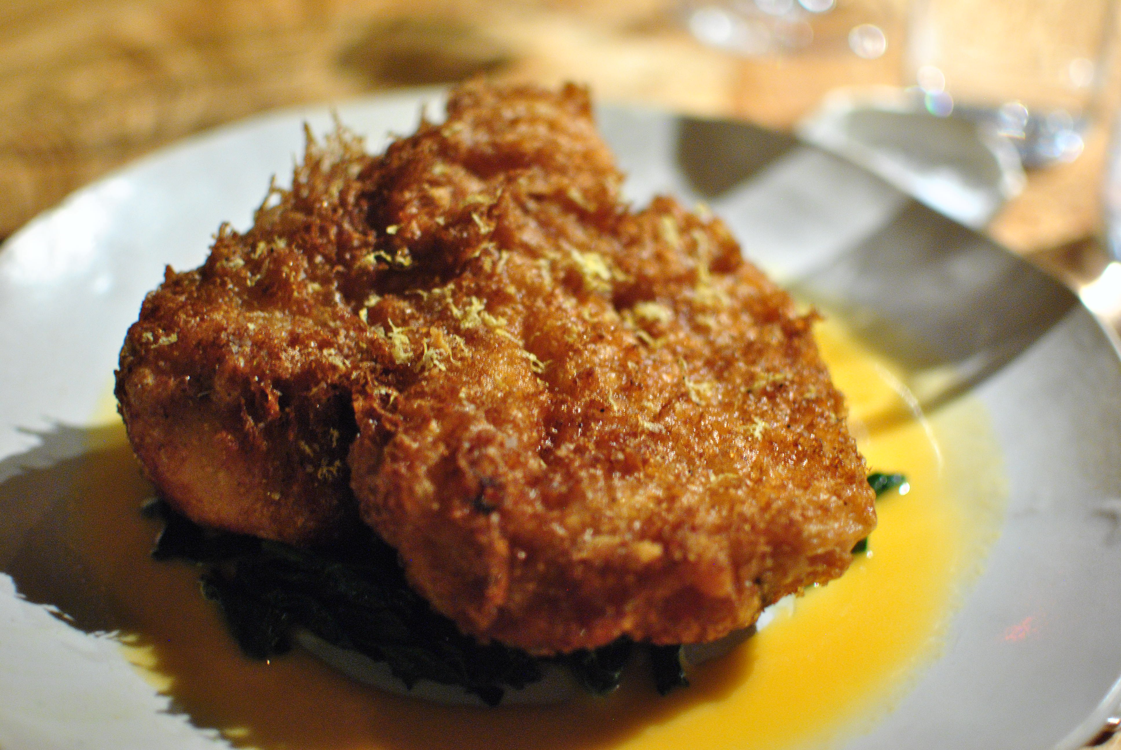 I don’t normally take pictures of other people’s food or comment too much about dishes that Josh and I didn’t order, but the minute I saw Alice’s fried chicken, I knew it would be something special. The piece of chicken was absolutely massive, with both dark and white meat, and fried to a perfect crisp. The batter was delicate and not remotely greasy, while the chicken inside was juicy and succulent. It was served with collard greens (yum!) and a hot butter sauce.
