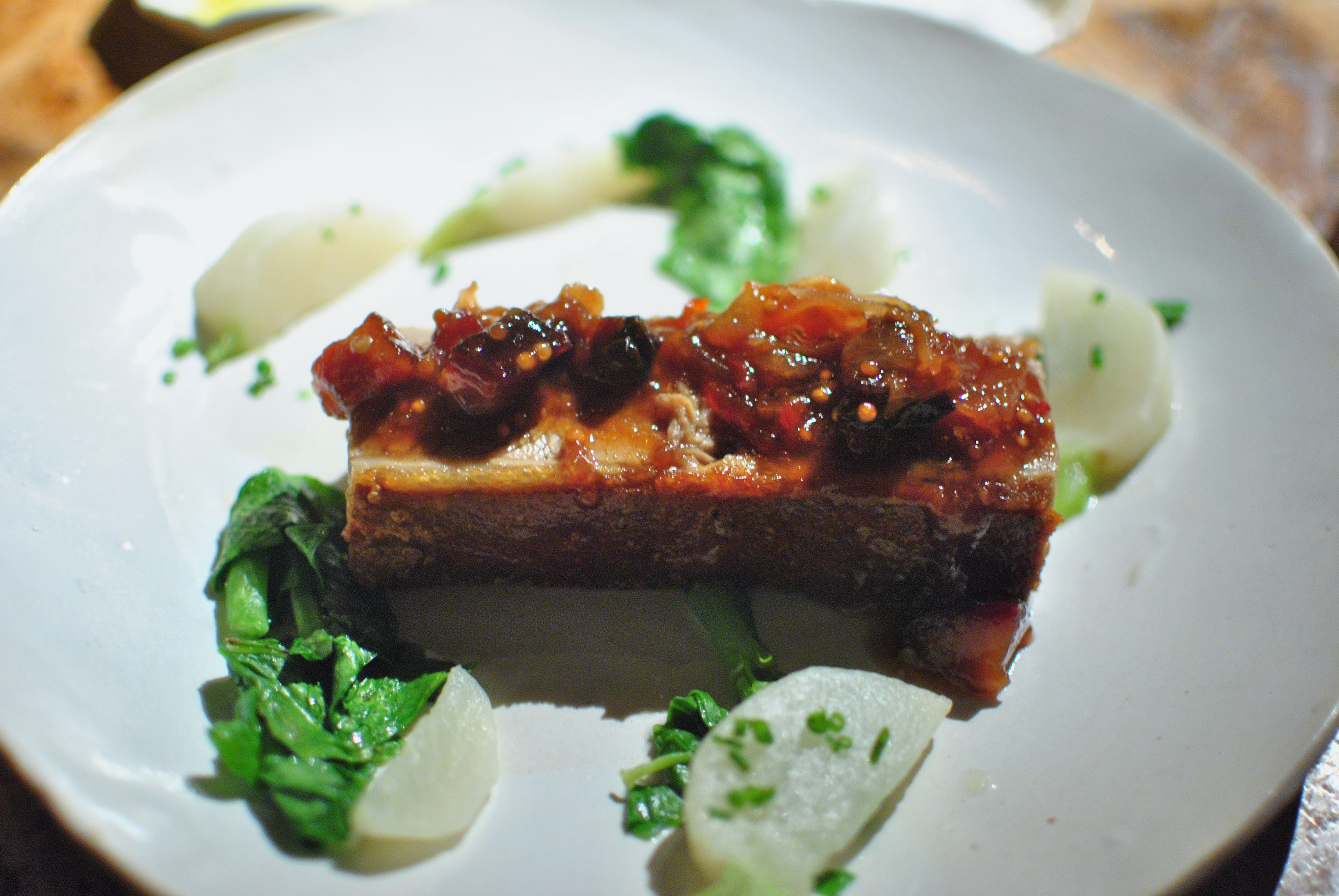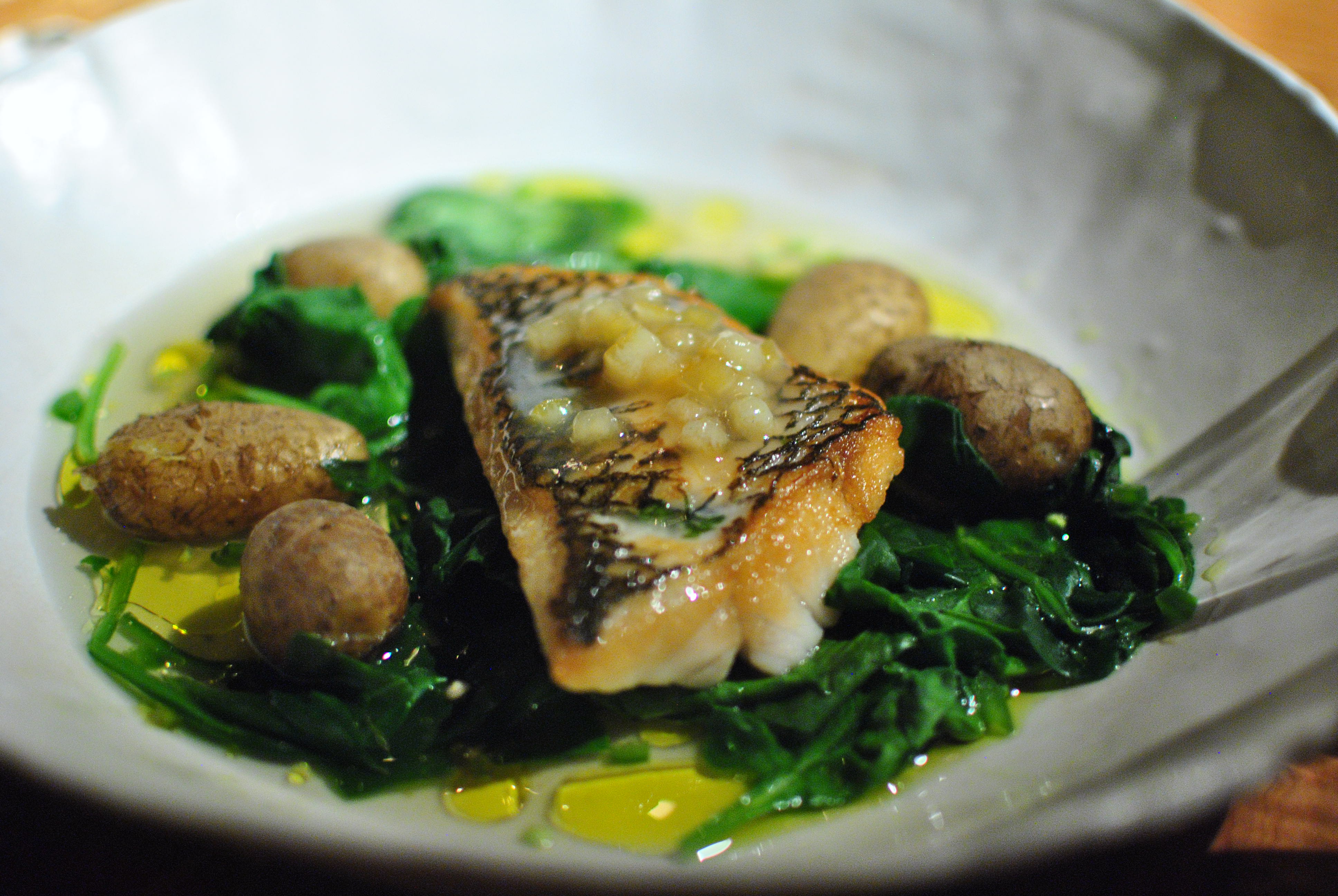 The roast suckling pig was my favorite dish of the evening. It was outrageously decadent, with crispy crackling skin and a plum and smoked bacon marmalade on top. The meat was melt in your mouth tender, and I loved the sweet/smokey combination of flavors. I also enjoyed the braised turnips on the side, with the slightly bitter greens that helped cut through the richness of the dish. I almost didn’t want to trade plates with Josh, though I did enjoy the sea bass as well.