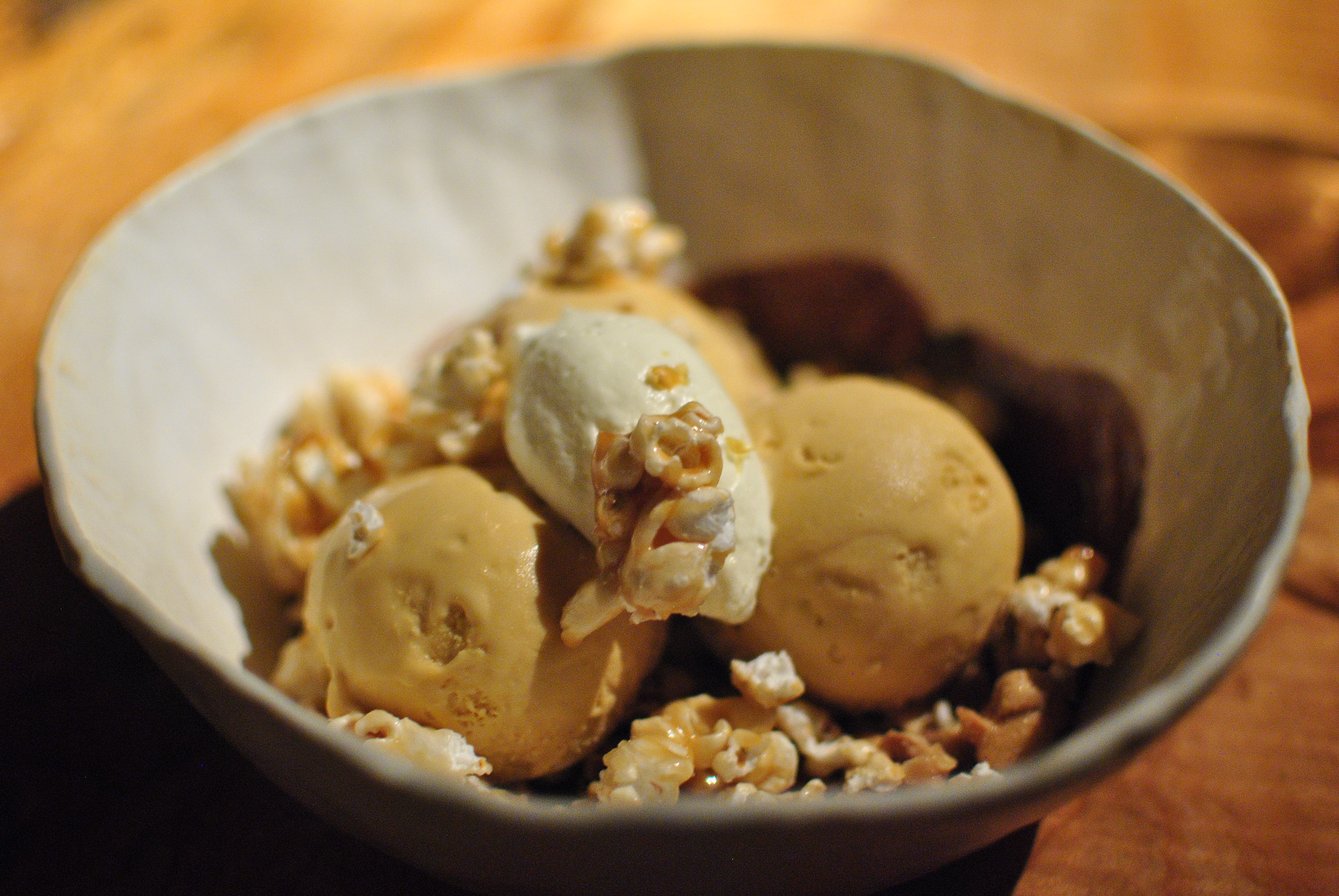 Josh’s sundae, however, was pretty fabulous. It featured salted caramel ice cream, candied peanuts and popcorn, whipped cream, and chocolate sauce. It was like a carnival in your mouth. While the ice cream was more caramel than salted caramel (it reminded me of dulce de leche ice cream), the peanuts made up for the lack of salt and the popcorn added a nice crunch. It wasn’t overly sweet, and the ice cream was a refreshing finish to our decadent meal.