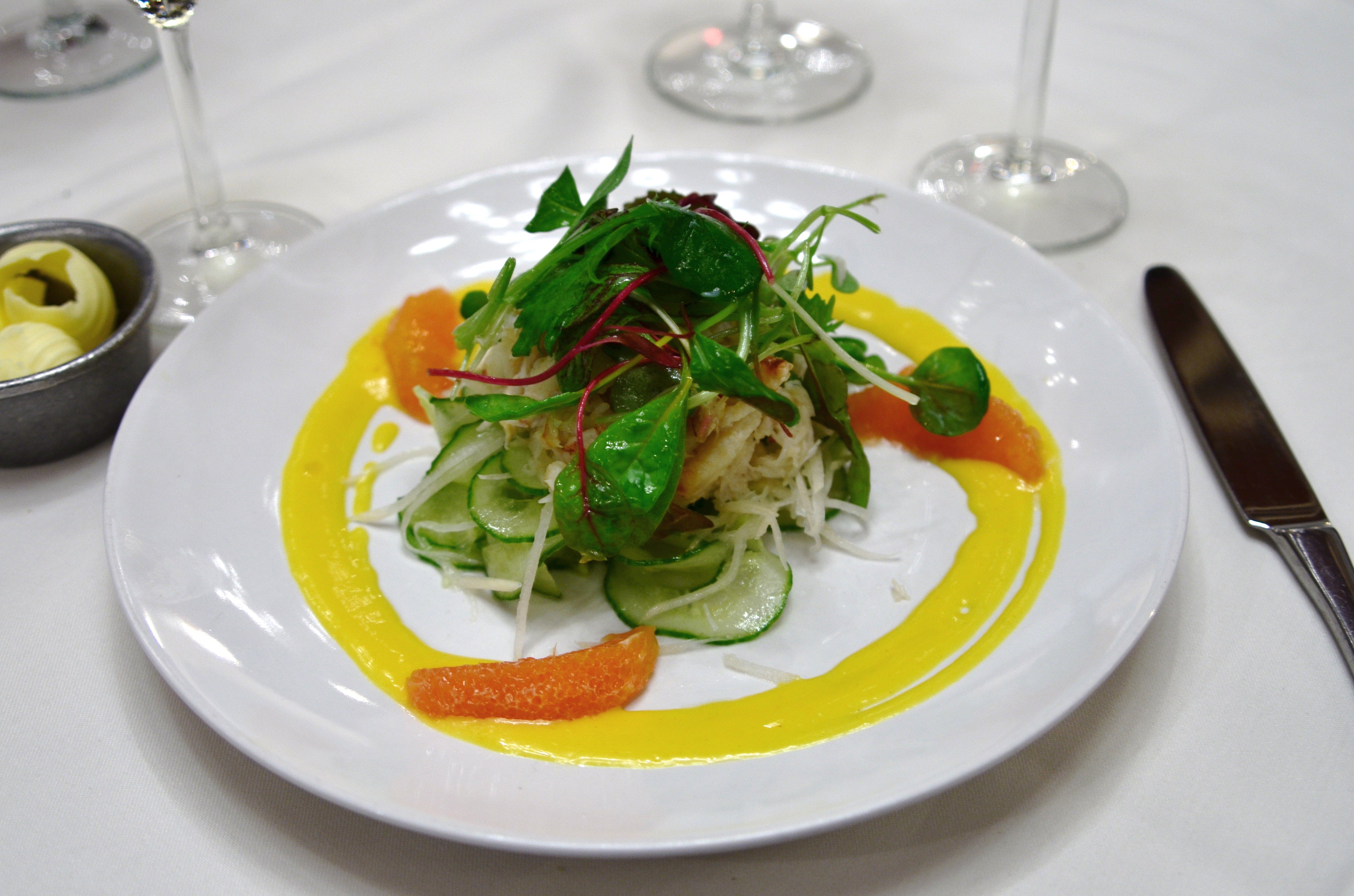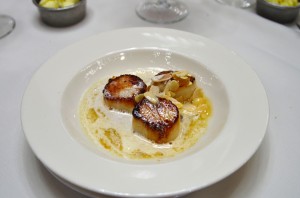The shrimp and okra beignets were loosely bound fritters that fell apart delicately when I cut into them. Though a bit messy to eat, they were delicious, with lots shrimp chunks inside, and just a hint of the oozy texture of the okra. They were served with salsa and cilantro-lime sour cream, providing a southwestern twist to the dish.