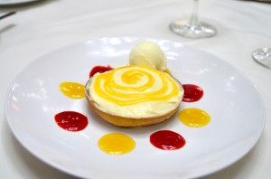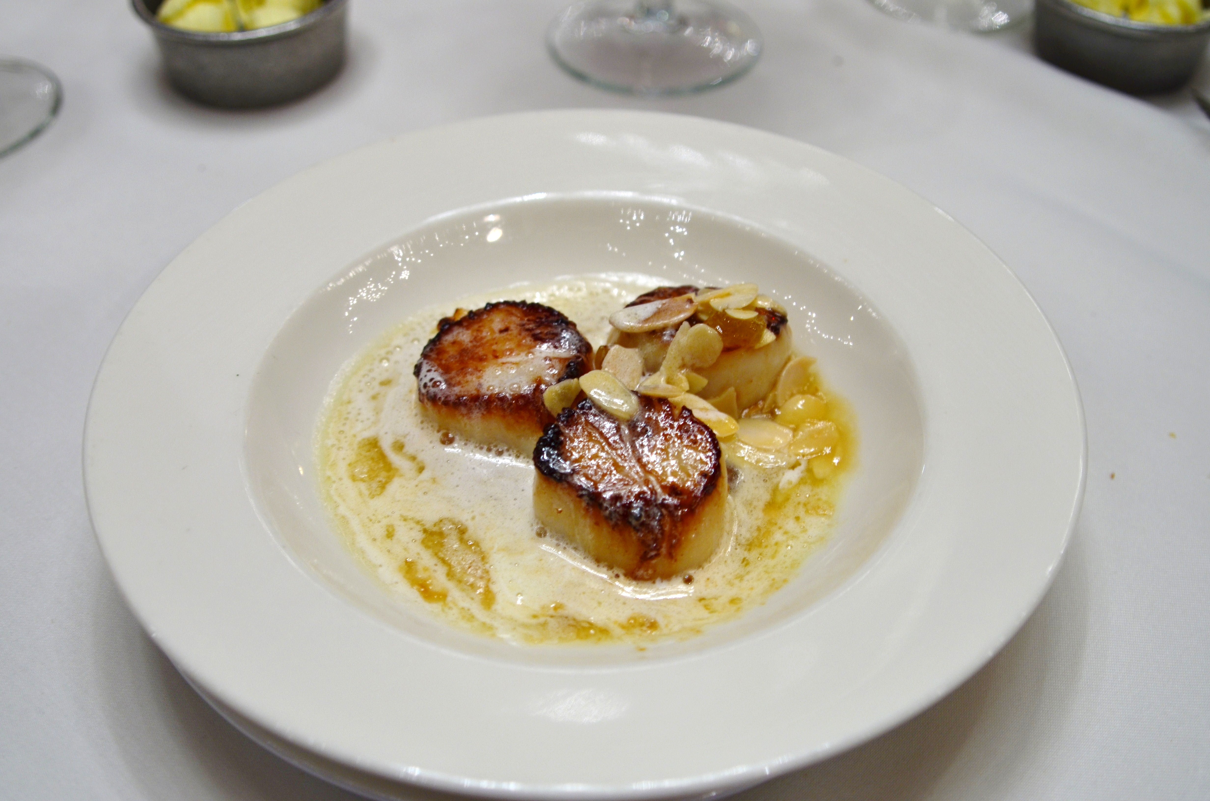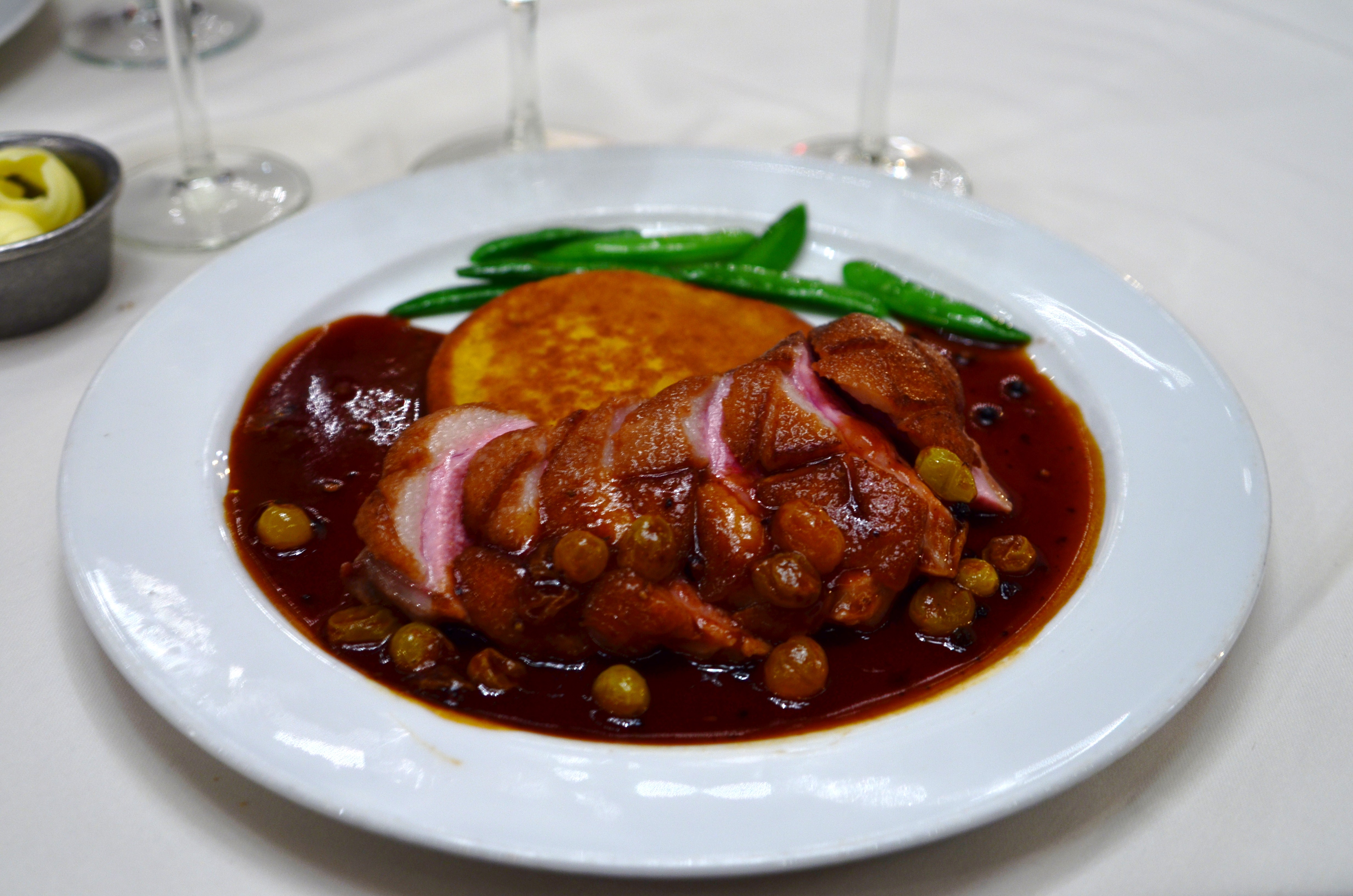 The shrimp and grits featured plump shrimp topped with sauteed mushrooms, scallions, and bacon over a bed of cheese grits. There was a lemon wedge on the side that we squeezed over the top, and added a healthy dose of hot sauce as well. It was a great combination of salty, sweet, tangy, and spicy, a big plate of comfort food at its best. My only quibble was that the dish was only served warm, not piping hot, and the grits weren’t as creamy as I prefer.