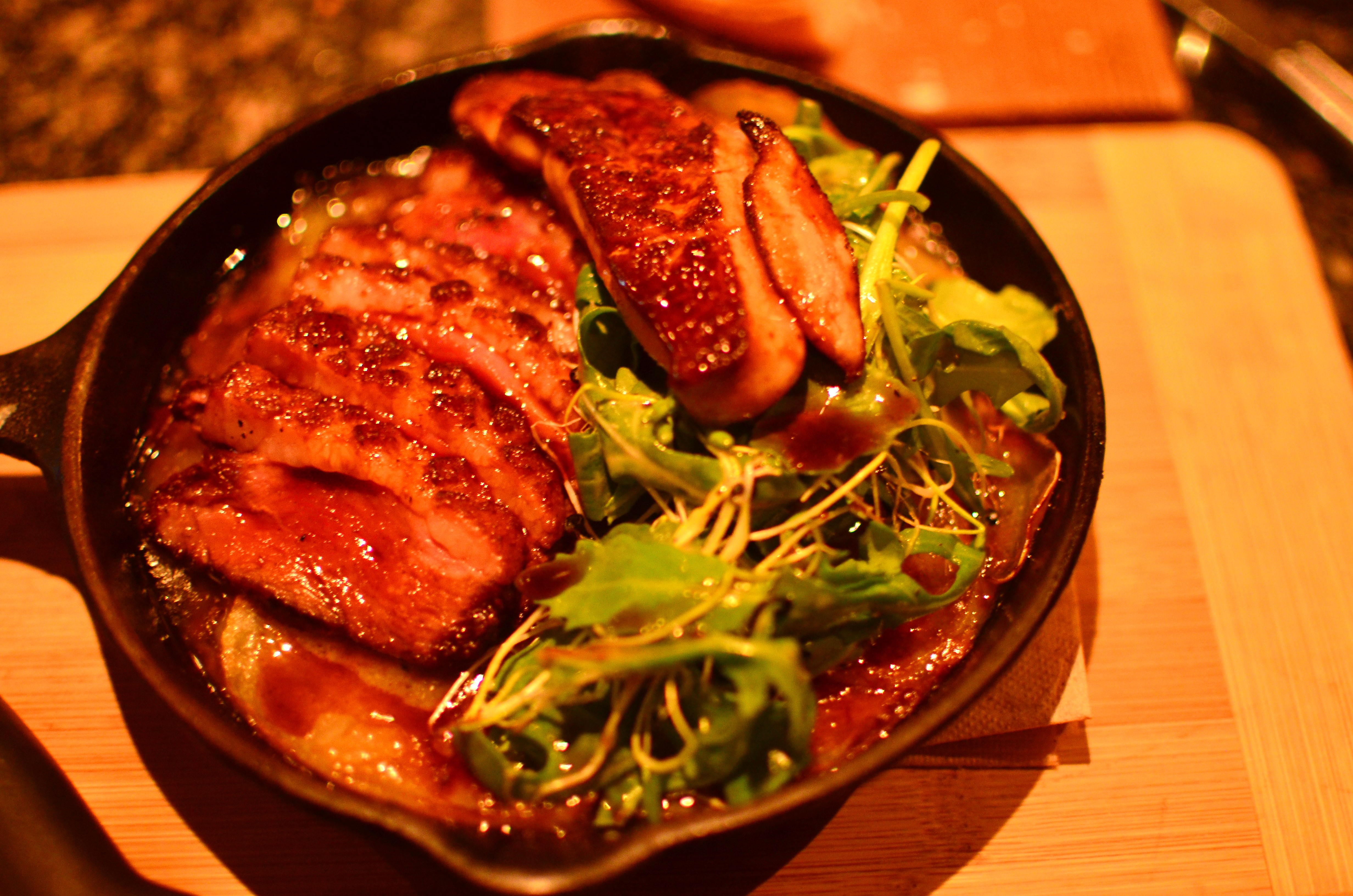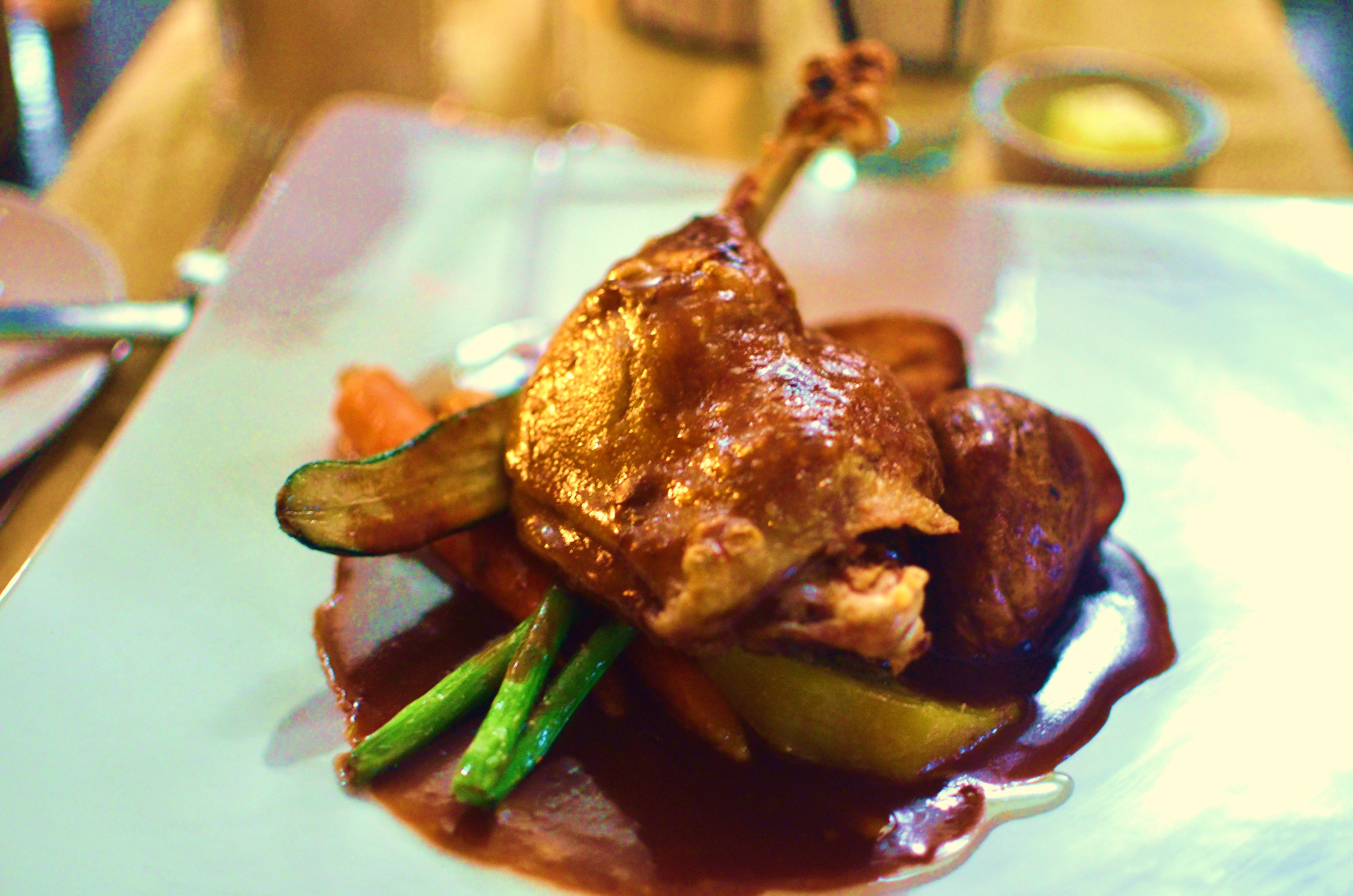 For my main course, I had even more foie gras. The dish was goose three ways – breast, confit, and foie gras. It was awesome, probably the best dish we had all weekend. The foie gras was out of this world. Perfectly seared, lightly seasoned, it was crispy on the outside and literally melted in my mouth. I don’t know if goose foie gras is superior to duck foie gras, but whatever the case, this was some of the best foie gras I’ve ever eaten. The breast was also seared nicely with browned skin, a melty layer of fat, and juicy, tender meat. It was still slightly pink, which I prefer. The dark meat confit was mixed around underneath with the scalloped potatoes in a pool of glorious goose fat. There was an arugula salad on top that provided a shot of acidity to cut through all the fat. It was definitely a rich dish, but not greasy or too heavy, and I had no trouble finishing most of the dish. It was paired with a syrah that was full bodied enough to stand up to the richness of the goose, and had an interesting “funky” flavor to it. By funky, I don’t mean bad. It was earthy, tasting almost unfiltered. Maybe that’s what natural wines are supposed to be like?