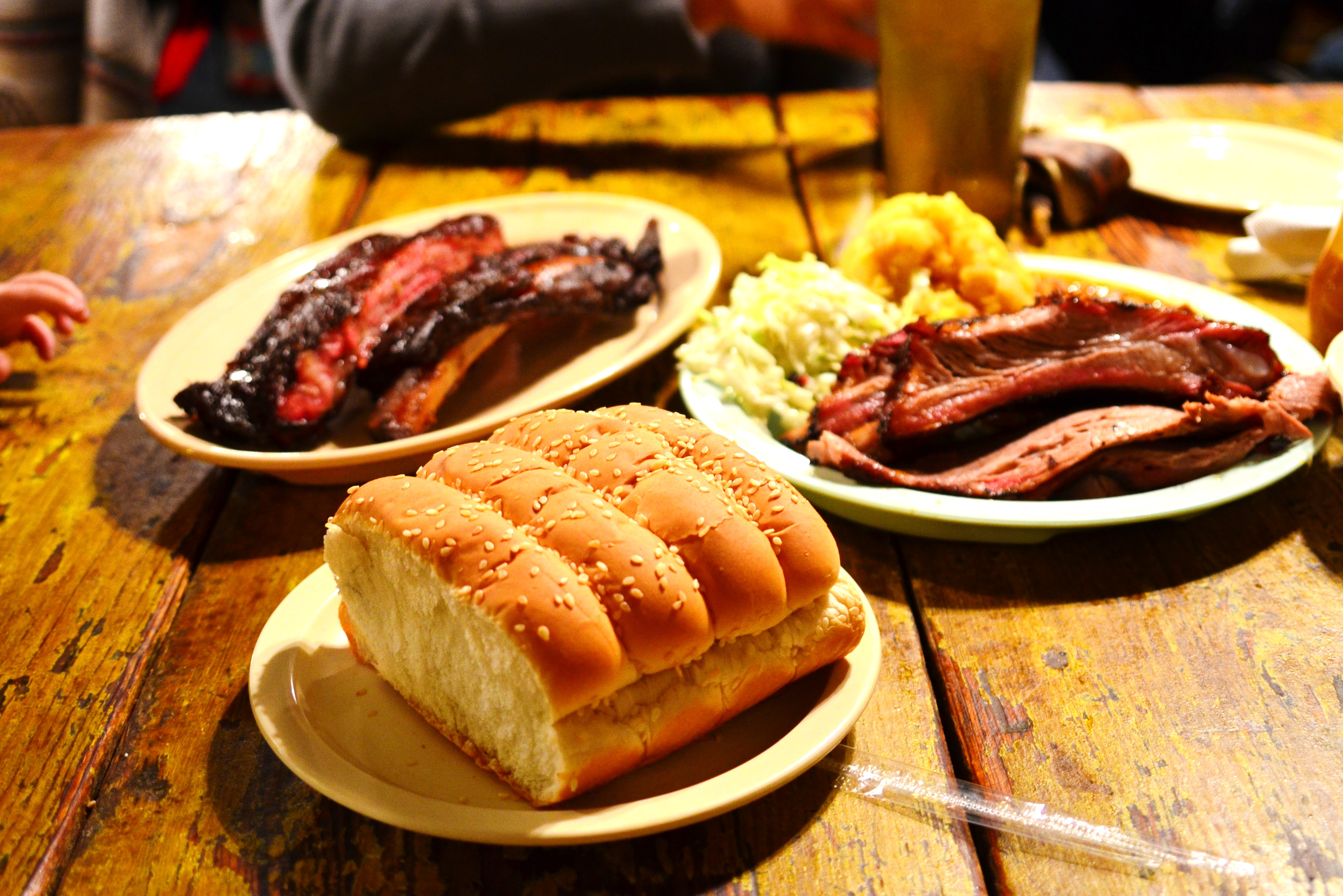 We ended up getting a huge table in the back just for the three of us, which gave us plenty of room to accommodate J’s high chair and spread out. We debated ordering family style, which is basically all you can eat beef brisket, pork ribs, and sausage, as well as sides, but we weren’t super hungry and didn’t want to overdo it. At $21.95/person though, it’s a pretty good deal, and a lot of groups around us appeared to be partaking. Instead, we shared combo plate and one double cut beef rib. The combo plate came with two meats, and we selected brisket and pork ribs (the other choices are sausage or turkey). It came with potato salad, cole slaw, and beans on the side, as well as soft bread, pickles, and onions.