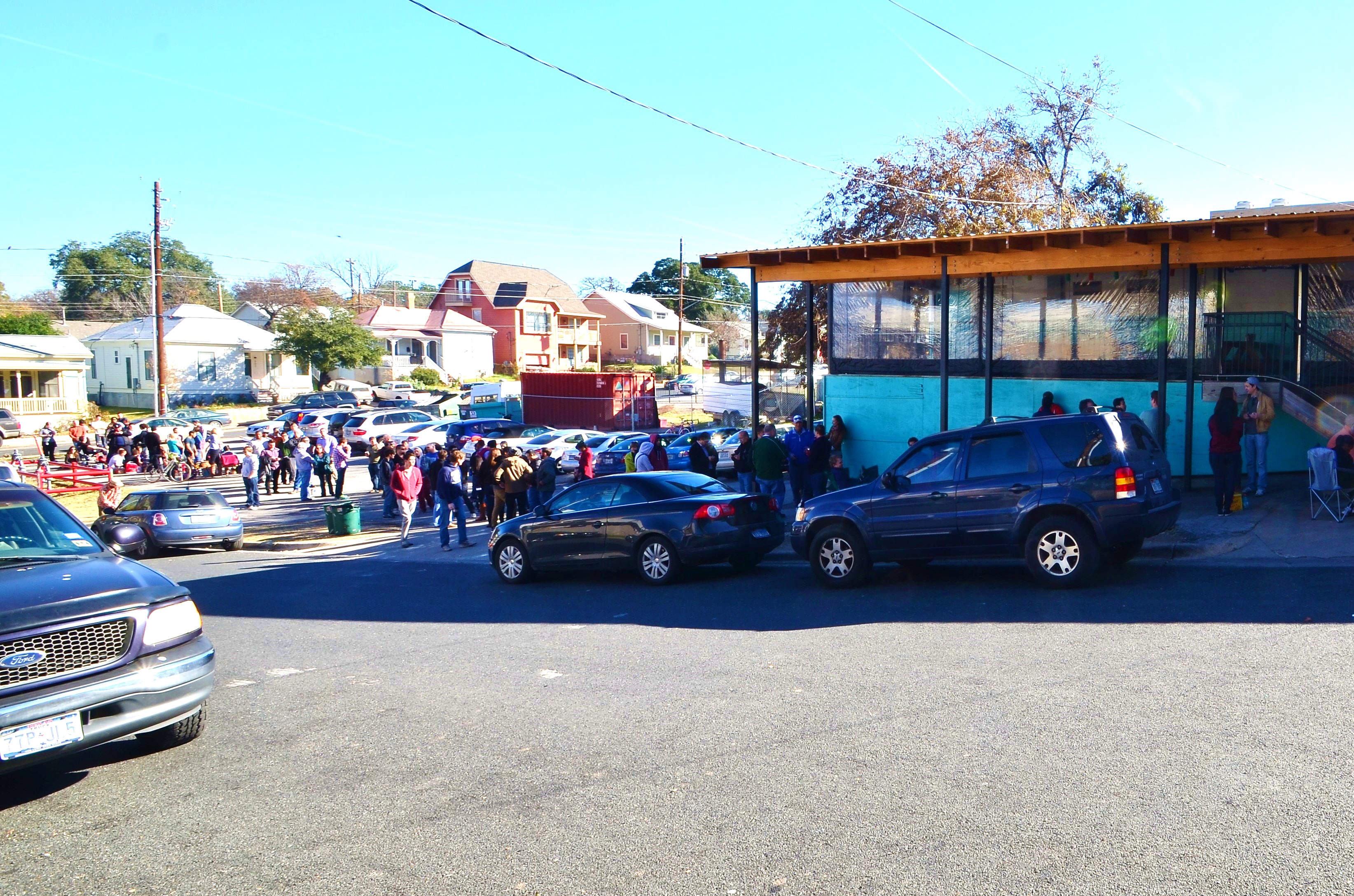 It was a pretty short walk from our hotel to Franklin Barbecue, and as the restaurant came into sight, the line didn’t look too bad. Only when I got closer, and could see down the hill from the building, did I realize just how far it stretched.