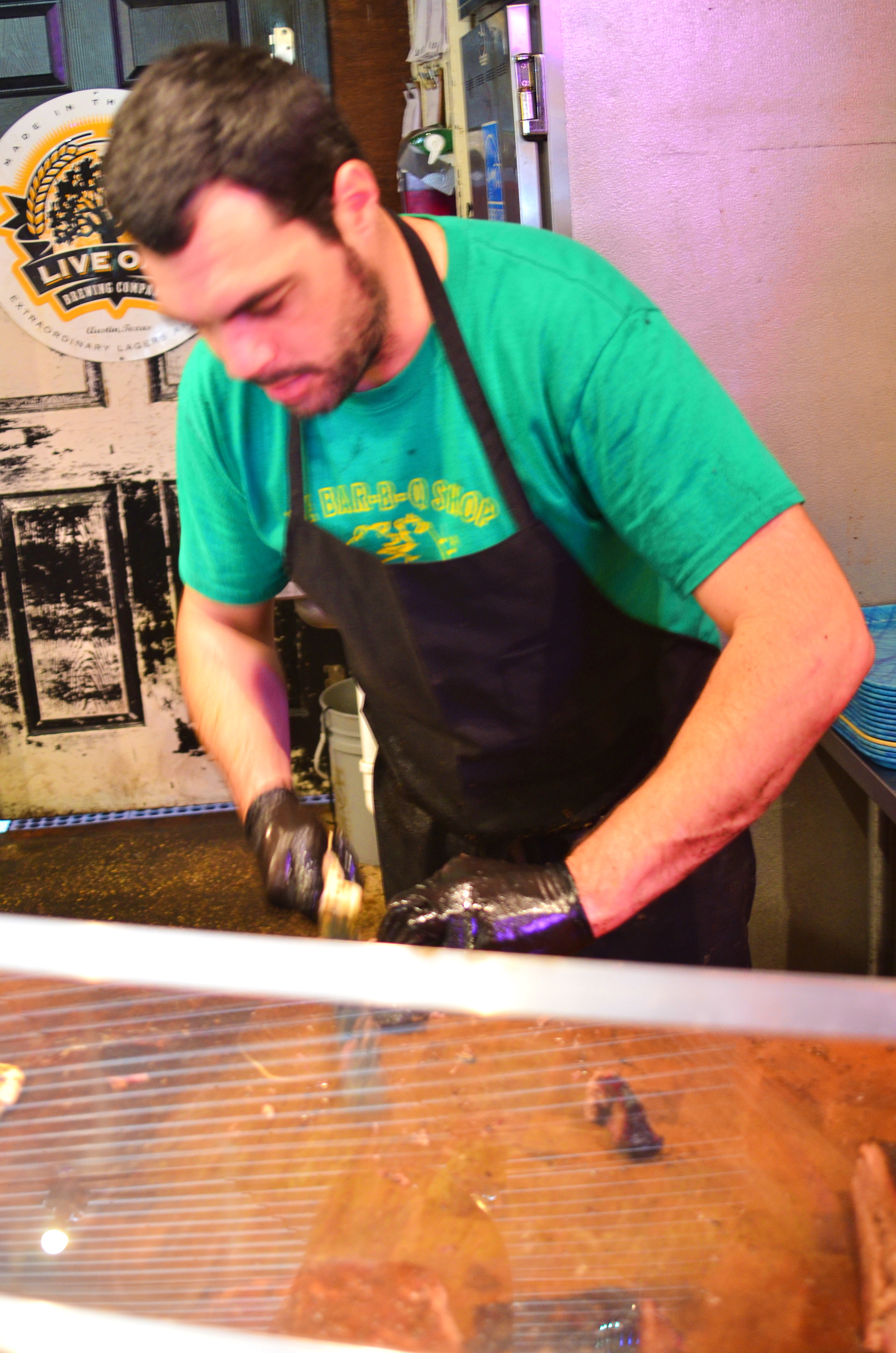 When we ultimately made our way up the ramp and inside the restaurant (a triumphant feeling, 4 hours after Josh first started waiting), we could finally see what was going on. There’s still a decent wait from the time you get inside until you reach the counter to order, and the reason for that is the man himself – Aaron Franklin. Not only was he taking everyone’s order and personally slicing every brisket, he was greeting and chatting with each person that came up. When it was finally our turn, he asked us where we were from, gave us permission to take pictures, and then made fun of us for not ordering enough food (I guess most people order a lot and take home leftovers, which wouldn’t have been practical for us).