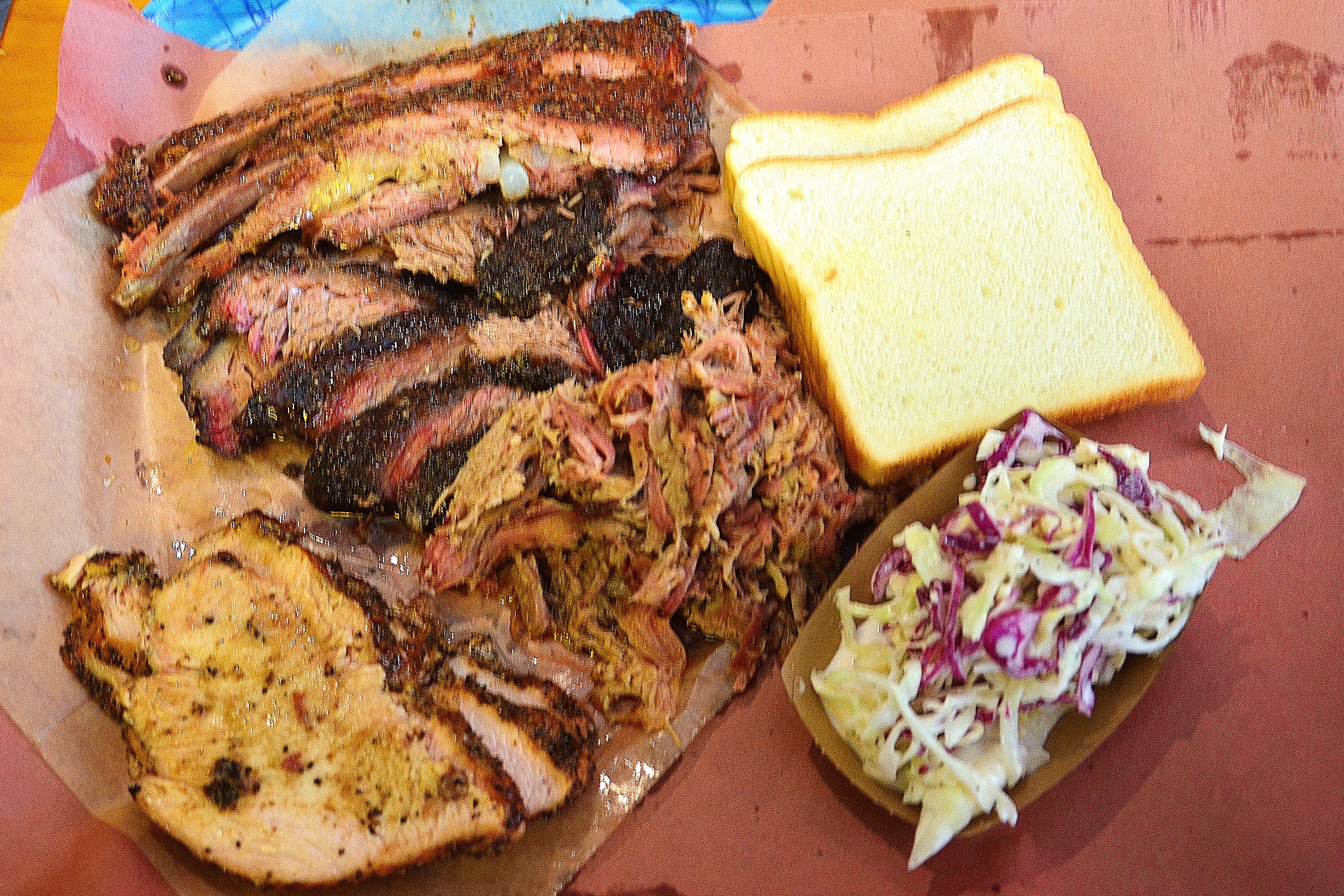 Ribs up top, fatty and lean brisket, pulled pork, turkey on the left, plus bread and cole slaw