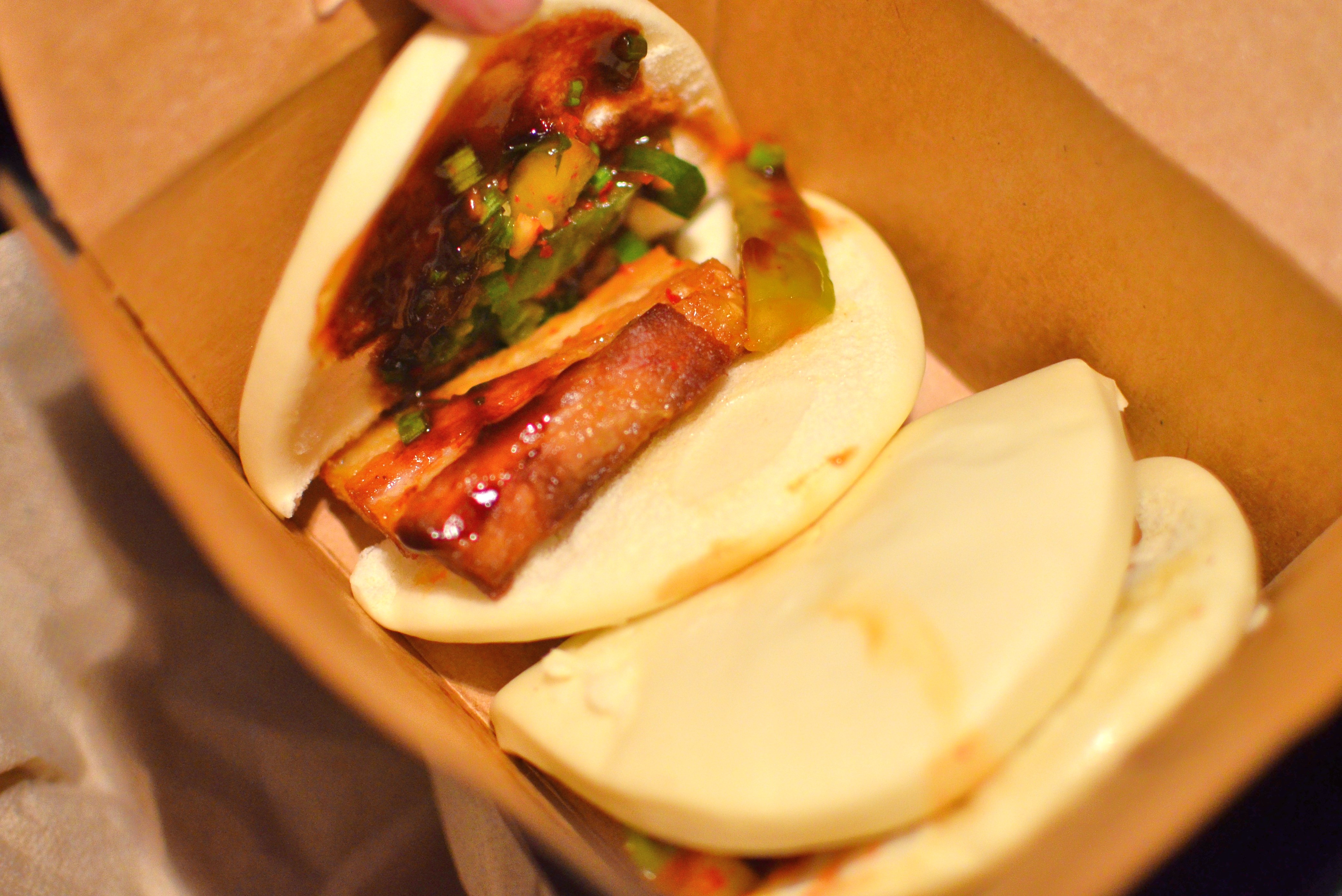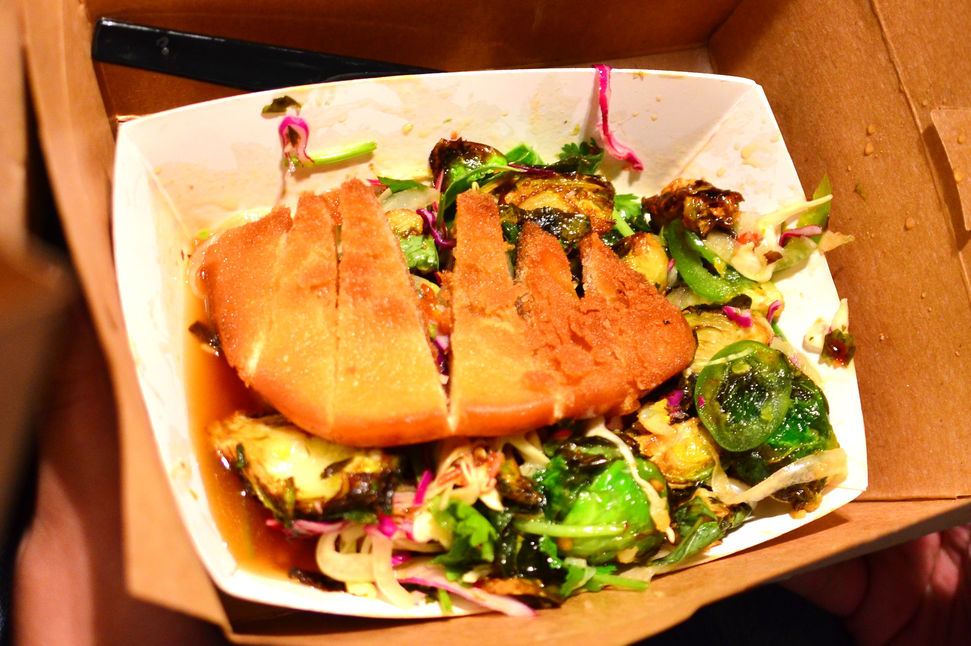 It worked out pretty well, as the food was neatly packaged in takeout containers that allowed us to eat easily without making a huge mess. First we tried the brussels sprout salad, which was fried brussels sprouts with shredded cabbage, onions, and assorted herbs tossed with a sweet-spicy sauce. The brussels sprouts had a good char on the outside and had a nice texture to them – not mushy. The dressing and the herbs gave the salad a southeast Asian flavor, and it was both sweet and savory at the same time. There was lots of mint, basil, and cilantro, which made it quite a refreshing dish that was well balanced. The salad was topped with a deep fried mantou bun.