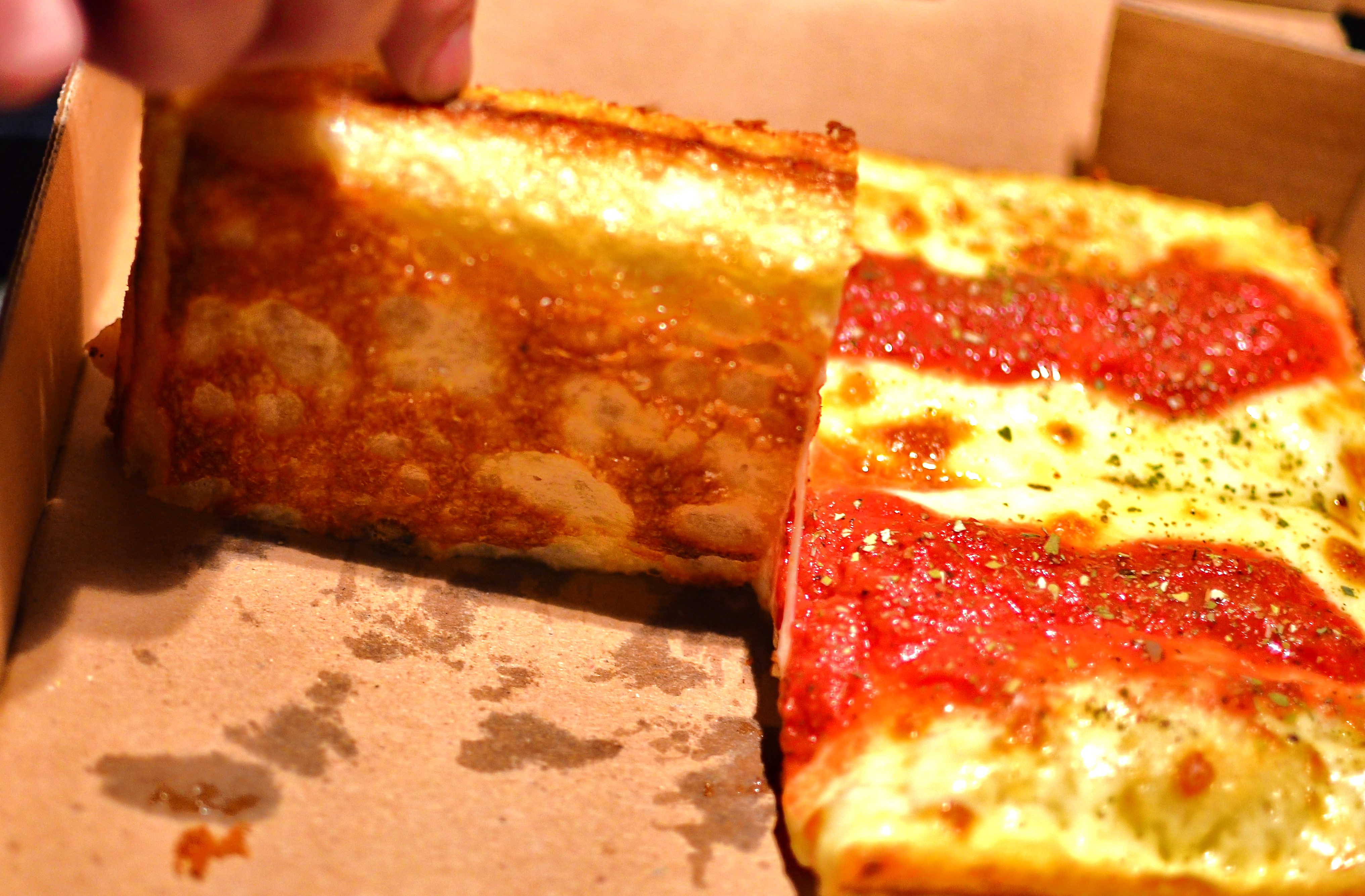 The crust was lighter and more airy than a usual Sicilian, though the very middle was a little doughy. The pizza is baked in a pan, so the bottom and sides are nicely browned. The cheese covers the entire top of the pizza, all the way to the edges where it gets all caramelized and crispy – that was the best part. The sauce was tangy, not too sweet, though I did wish there was a little more of it.