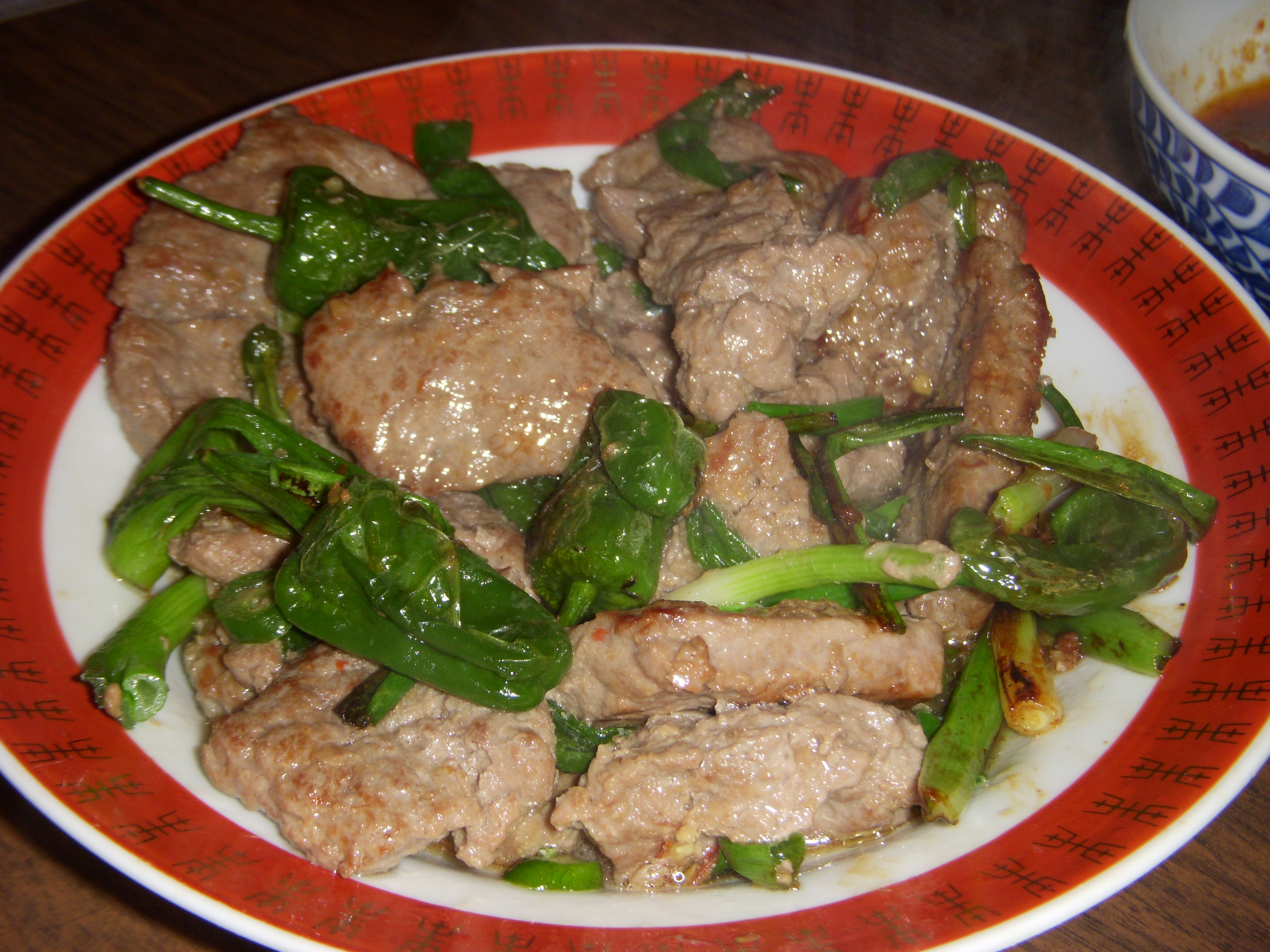 Stir fried beef with scallions, chilies, and pimientos de padron