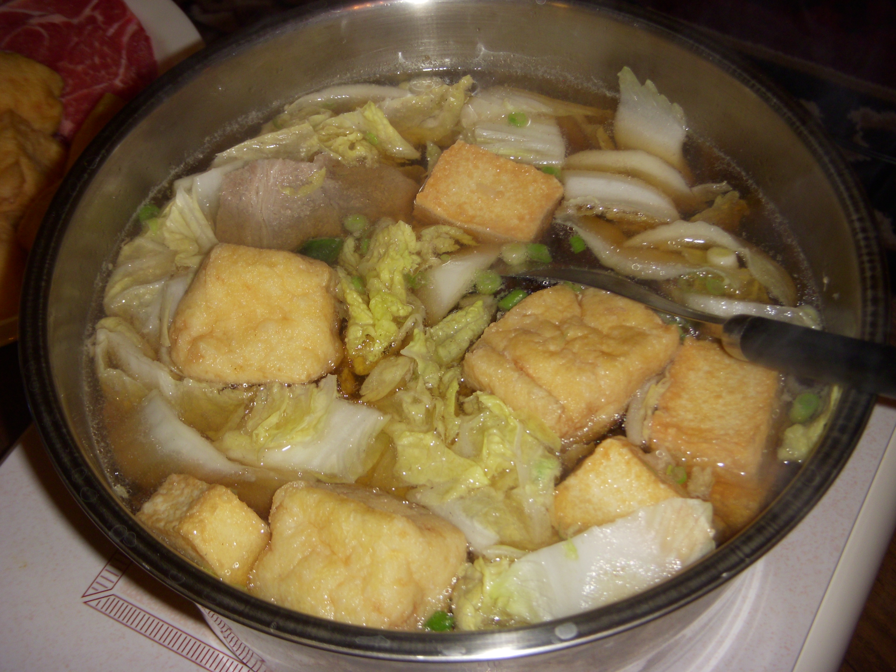 Hot pot chock full of tofu, fish cakes, cabbage, and pork