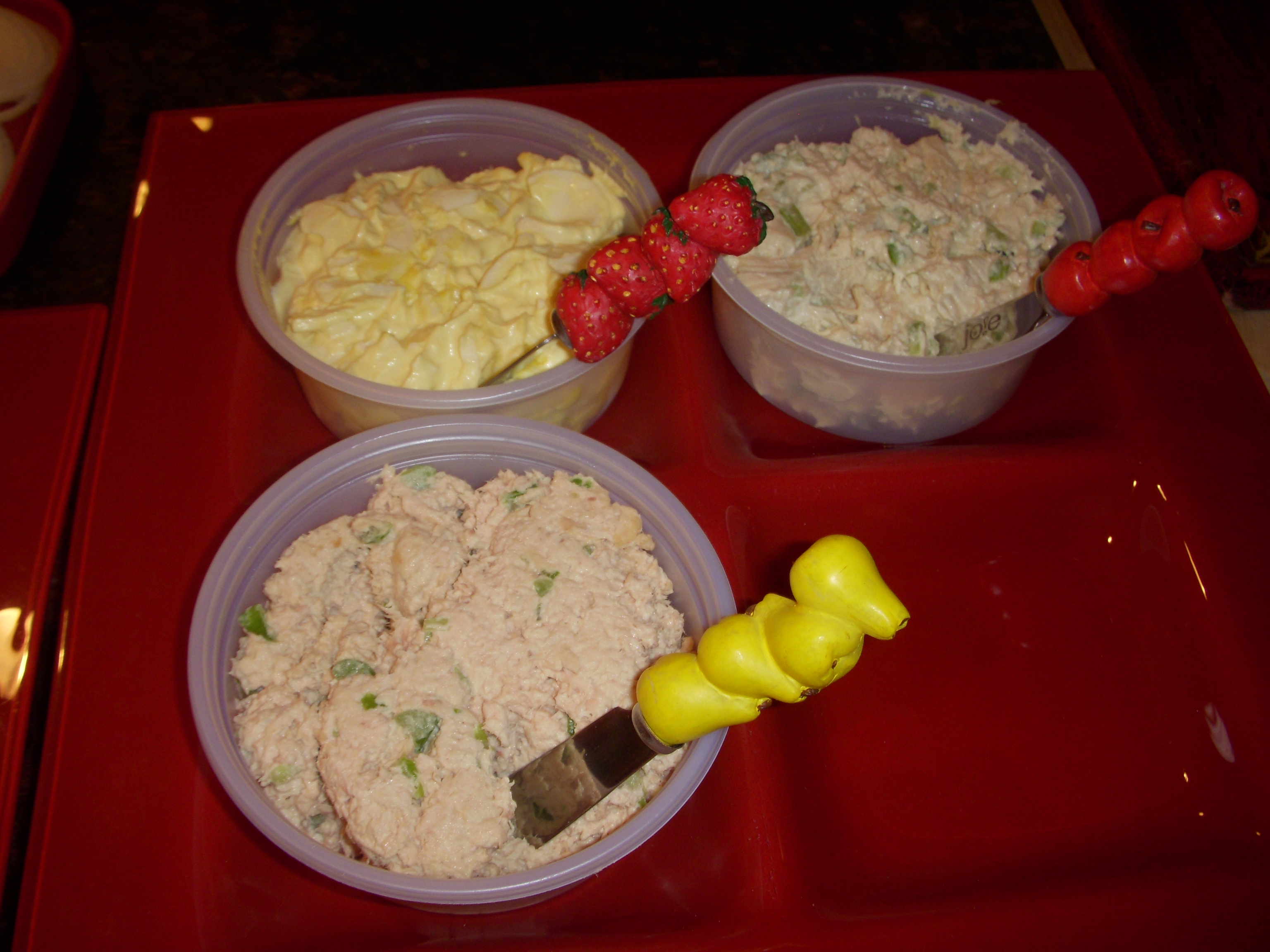 Tuna salad (in front), egg salad, and chicken salad